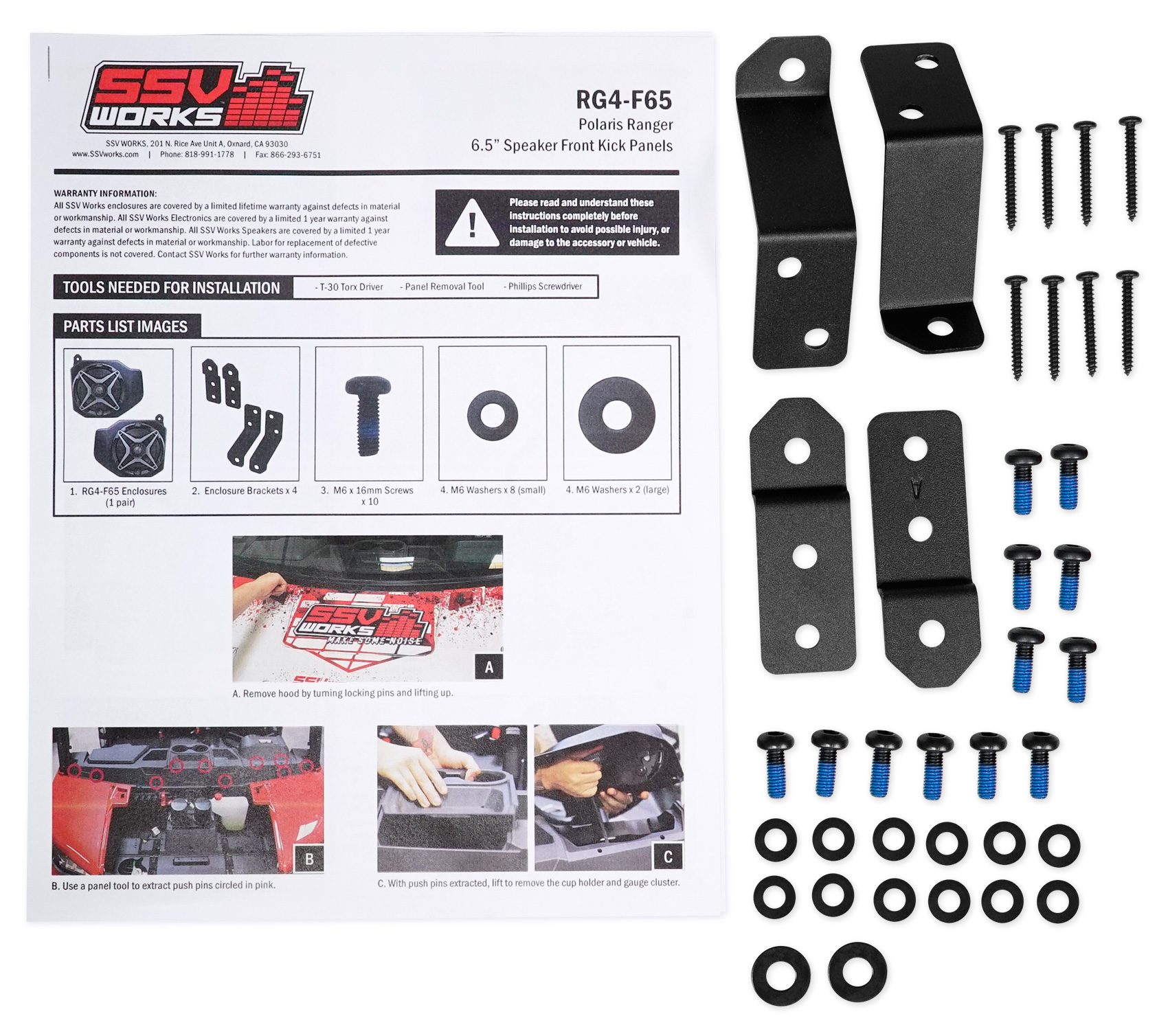SSV Works Polaris Ranger XP1000 2018+ custom molded kick panels are designed for 6.5" speakers and bolt in the upper foot well away from your feet. They are 100% fiberglass for the best sound quality and bass response. They are finished in a black texture coat to match Polaris textures and can be custom painted to match your color scheme. - Includes stainless mounting hardware and step-by-step installation instructions. Fits: Ranger XP1000 2018+