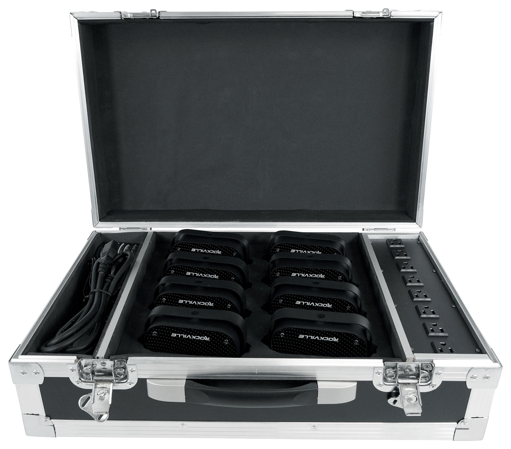 This durable rolling hard case can take a beating! We drop tested it with lights in it from 5 feet in the air on both sides and the case and lights did not get damaged. When you are ready to charge your lights after your gig or before your next gig, simply plug the fixtures into the central outlets within the case, and plug the case into the wall. (Keep the case open while charging so the lights stay cool.) The case will also hold your lights and power cables and remotes.