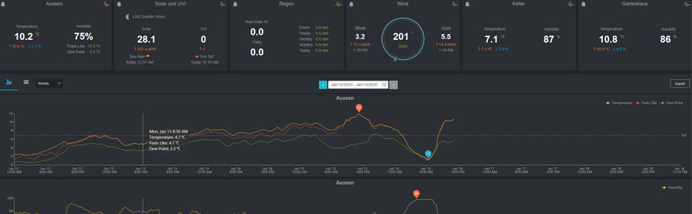 Grabaciones gráficas y de progreso, así como una descarga de datos en el servidor Ecowitt (registro gratuito): Esto significa: Todos los valores medidos de los sensores conectados se muestran claramente en el servidor Ecowitt y, si lo desea, como un gráfico y se pueden descargar . También tiene la opción de hacer que los datos estén disponibles para allen demás usuarios o solo usted tiene acceso y conocimiento.