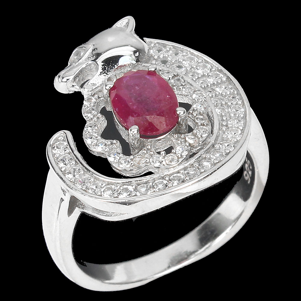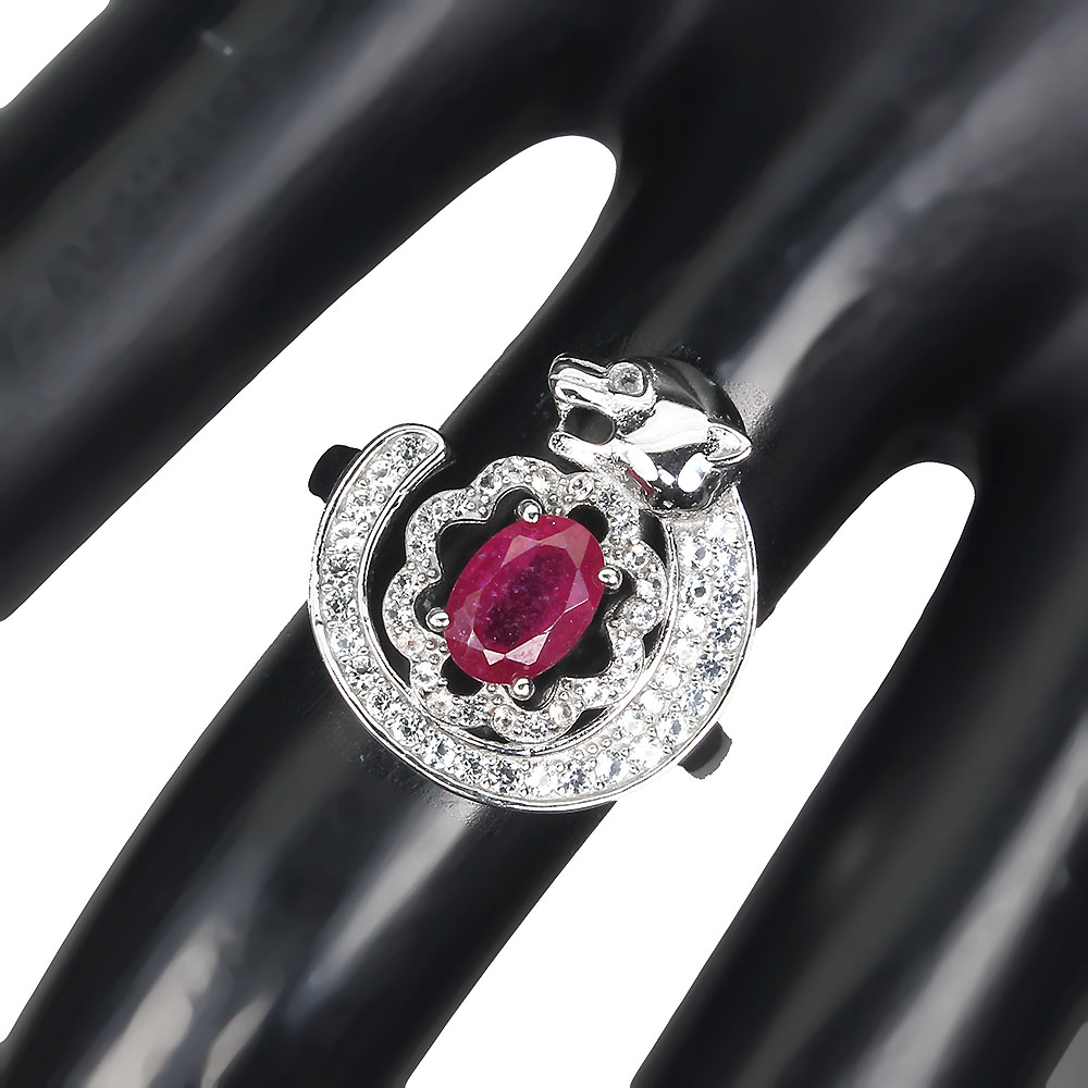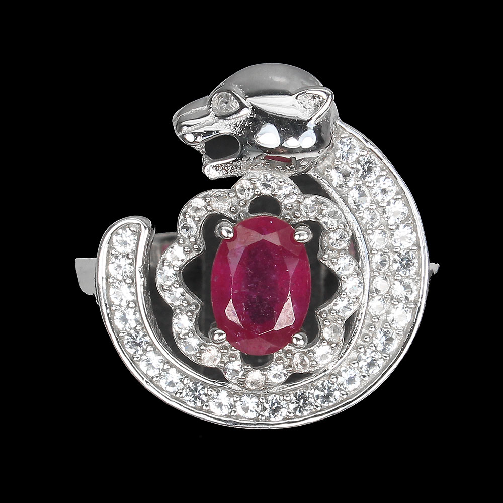 Heated Oval Red Ruby 7x5mm White Topaz 925 Sterling Silver Tiger Ring Size 6.5
