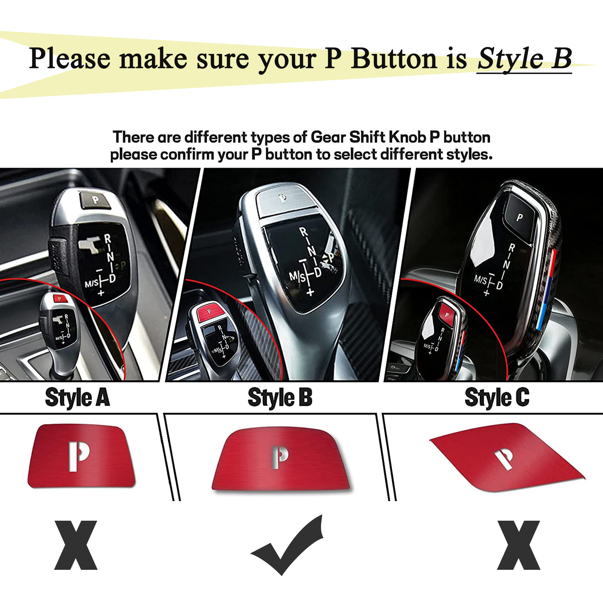 This listing is for 1pc Red Aluminum Gear Shift knob Lever P Parking Button Cover Decor Trim Sticker For BMW 2 3 4 5 6 Series X3 X4 X5 X6.