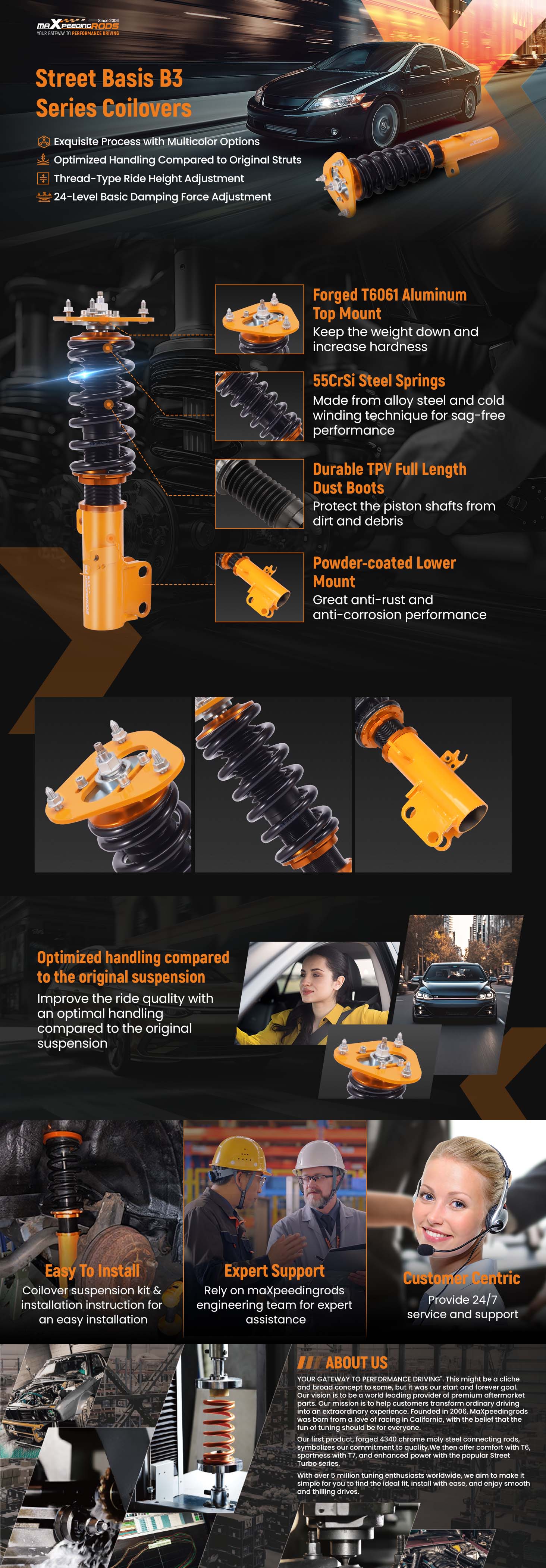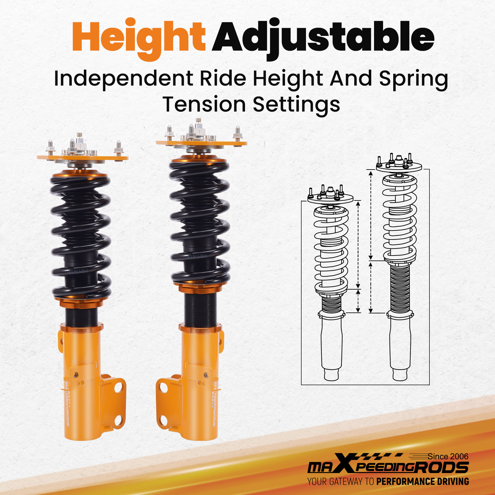 1. Lowered height adjustment from 25-75mm (depends on vehicle models) which allows a lower center of gravity and also adds a more aggressive stance