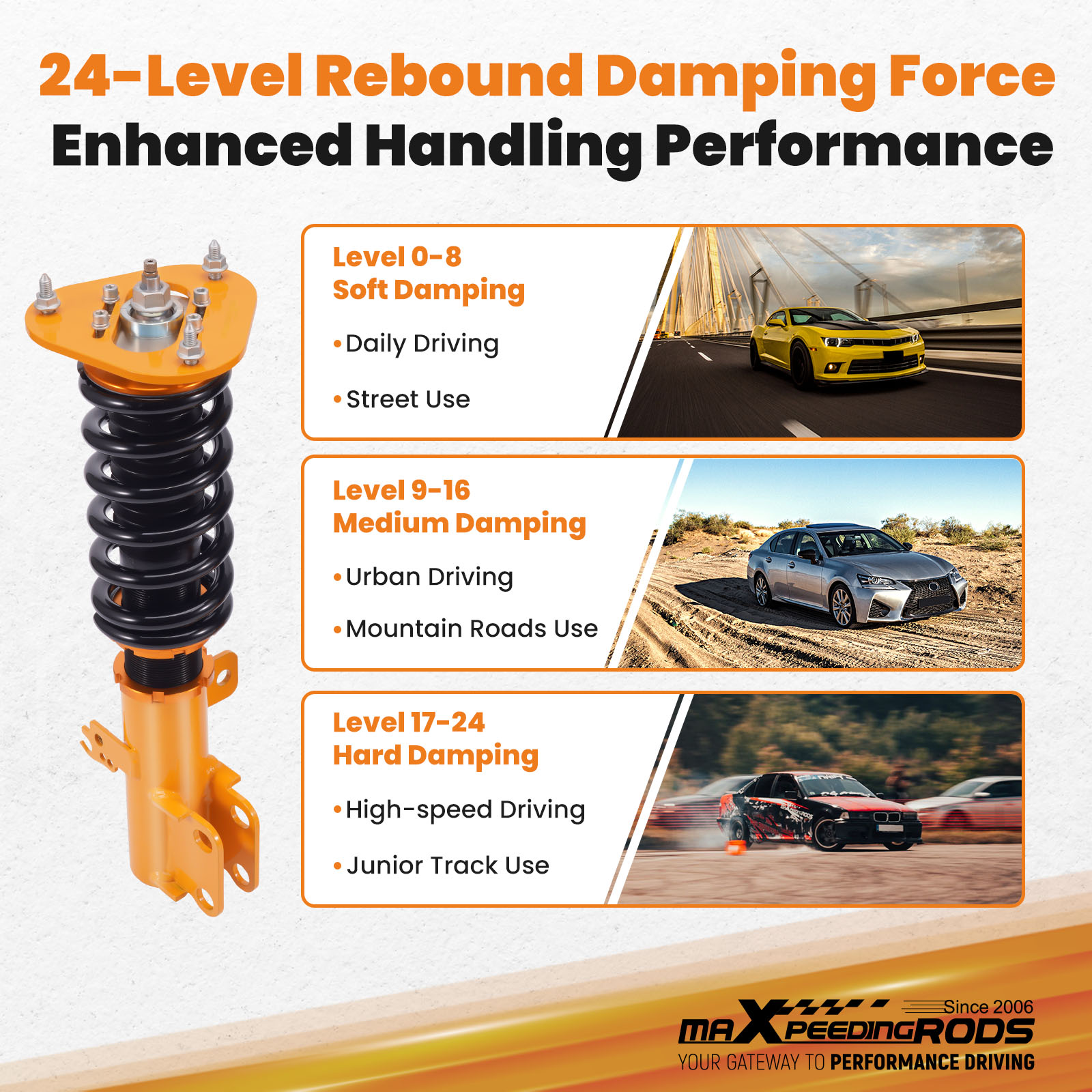 2.24 levels of adjustable damper -- This allows you the ability to perfectly dial in your coil-overs system. For nice comfortable driving, set damping to full soft. For more spirited driving, set it to 16 clicks. For occasional track days, set it to full stiff.