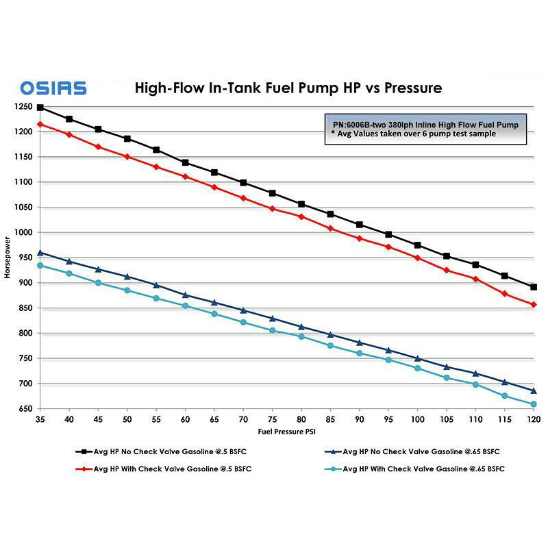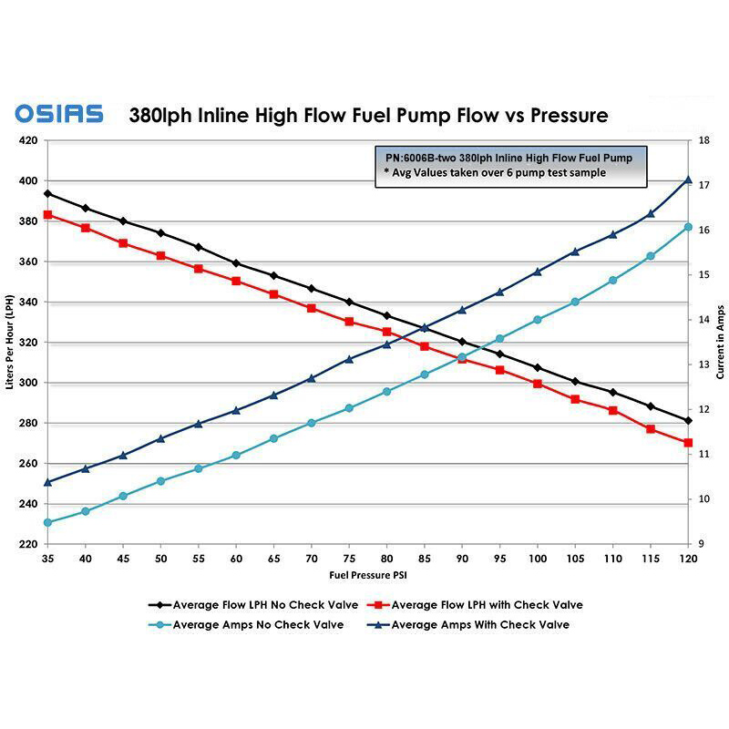 OSIAS' 380lph High Flow, High Pressure Fuel Pump is capable of supporting over 1,200 HP normally aspirated and a whopping 1,075 HP at 30 psi boost!* It flows 380lph (100gph) at 43 PSI, 340lph (90gph) at 73 PSI.