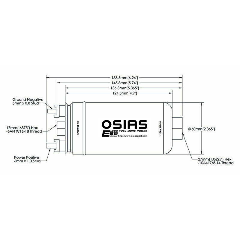 The OSIAS 380lph High Flow Fuel Pump is designed for use with gasoline. Alcohol fuels can be used, but pump life will be diminished. The inlet thread is a -10 AN female and the discharge is a female -8 AN .