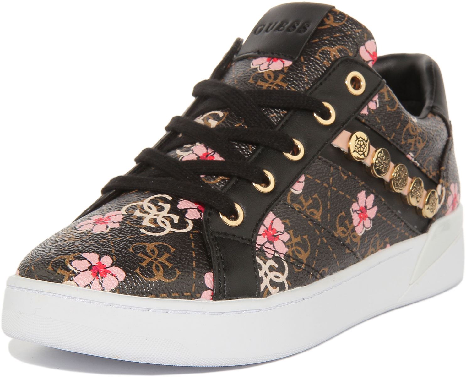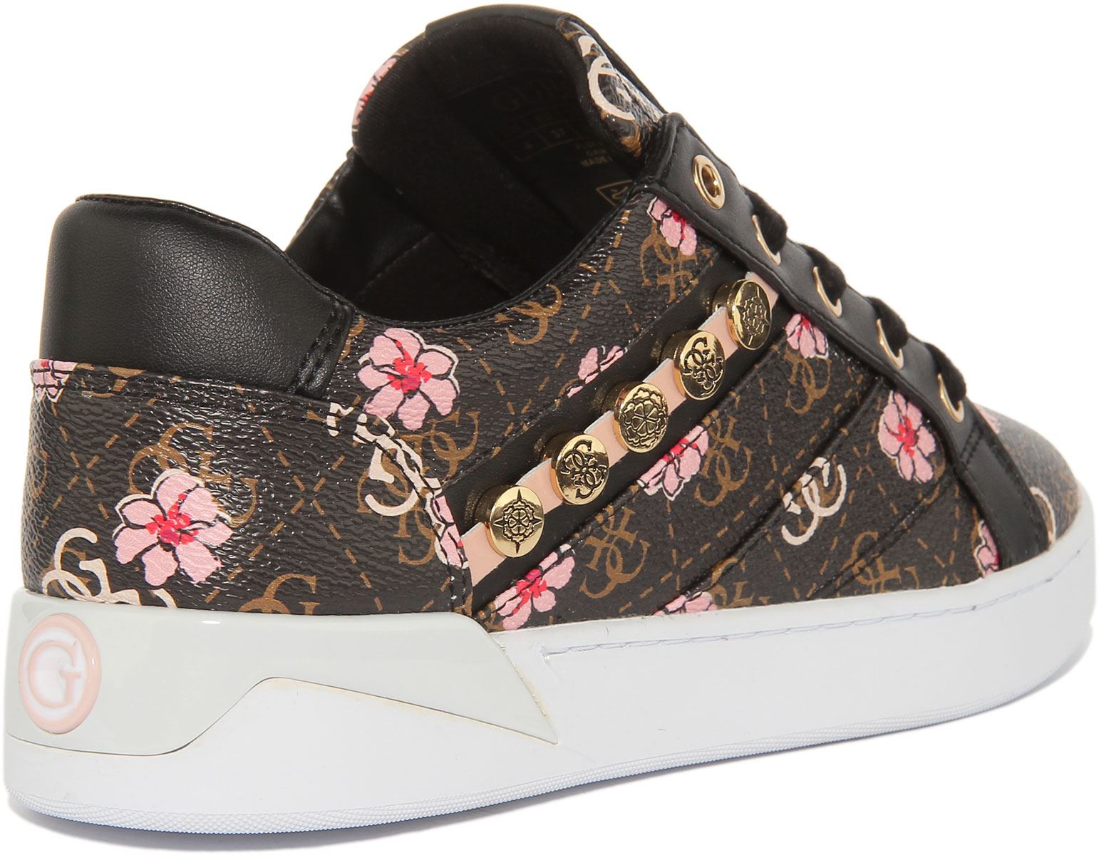 Step out in style in these Guess Roxo sneakers with 4G peony logo print. Made from premium synthetic, these sneakers feature round toe design and lace up closure. Fabric lining and leather insole provide all day comfort, while the rubber outsole ensures maximum traction on most surfaces. Finished with Guess branding, these sneakers are perfect for any casual occasion.