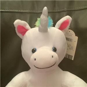this is the most adorable unicorn with soft white fur and rainbow mane and tail
