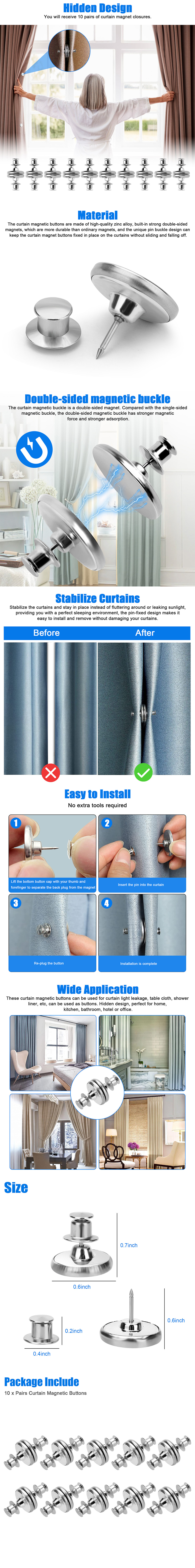 - ✨ Stabilize Curtains: Stabilize the curtains and stay in place instead of fluttering around or leaking sunlight, providing you with a perfect sleeping environment, the pin-fixed design makes it easy to install and remove without damaging your curtains. You will receive 10 pairs of curtain magnet closures.