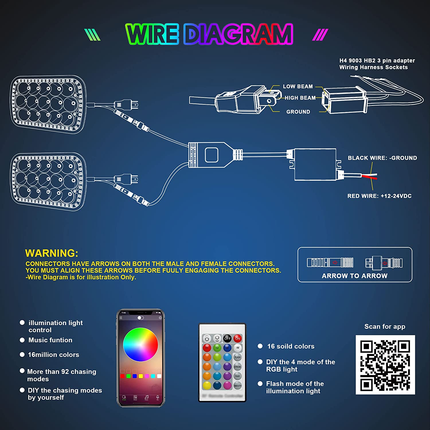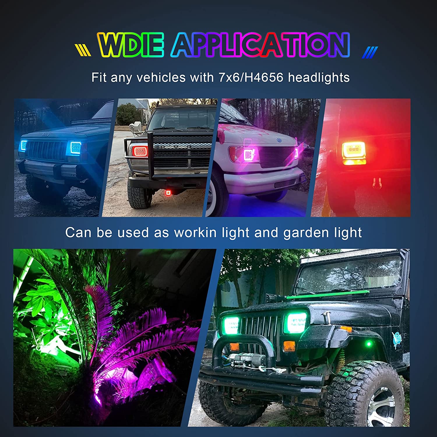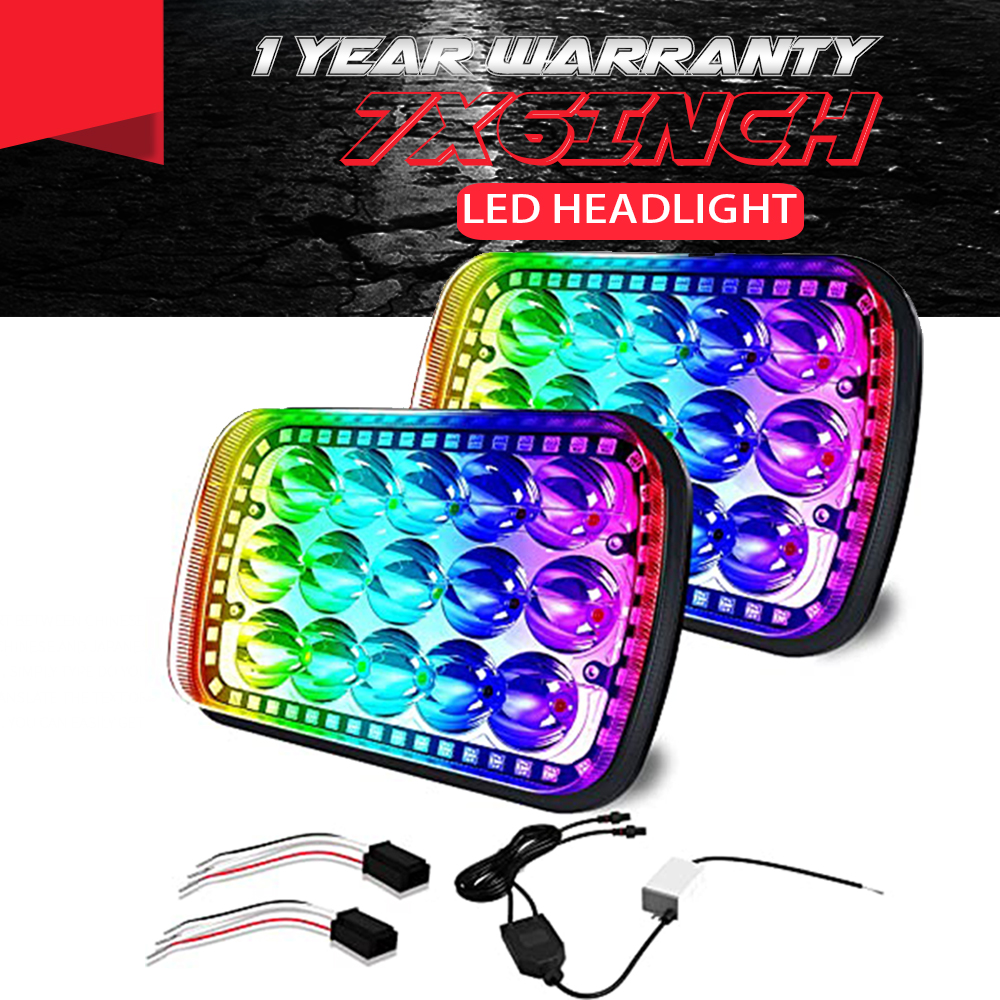 2.【7x6 LED Headliht with RGB Halo Ring Chasing Light】ROLINGER RGB Chase Halo with super bright 45w Headlamp for vehicles with 7x6 headlights sealed beam type also known as 5x7 led headlight offer reliable lighting and visibility. 16 solid colors and over 92 strobe flashing modes. Million of colors you can choose and the RGB 7x6 headlight will follow the rhythm of your music or your voice to glow, including rock, relaxing tunes and dance music. The APP or remote can be switched to control the whole 7x6 headlight smoothly.