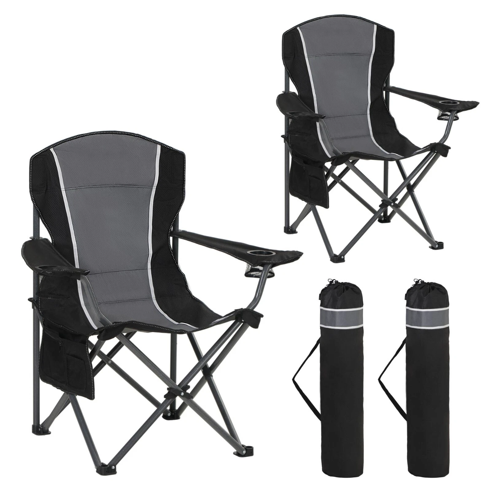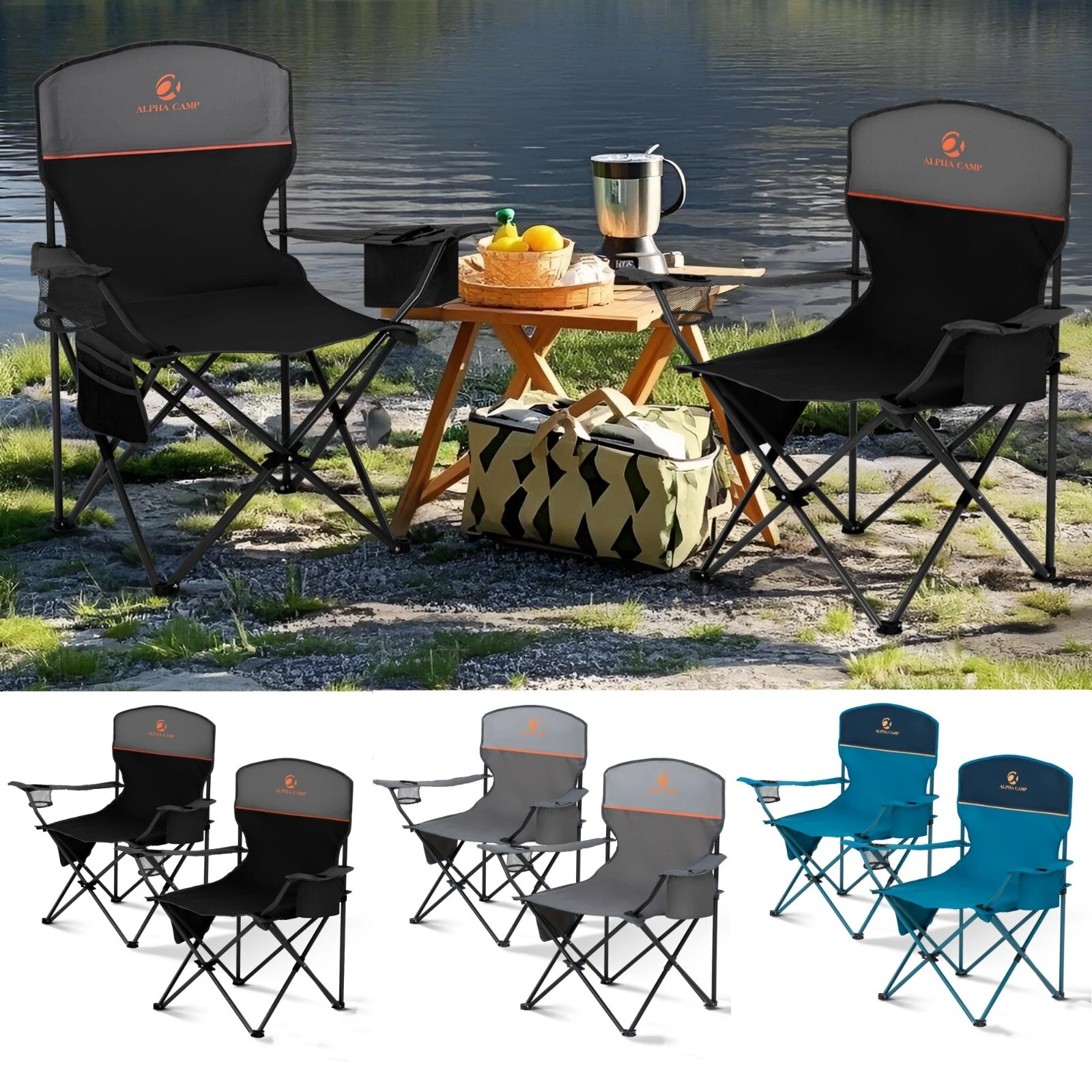 Materialć: Durable heavy-duty Steel frame + Oxford Fabric šćStorage Designć:with cup holders, one holds a larger 32-ounce drink, the other holds a standard cup size. šć1 Year GuaranteećWe try to make our camping chair as good as we can. If there is any part missing or damaged, free replacement or refund promised if there is any quality issue. š¦ćPackage Includeć2 Camping chairs + 2 carry bag