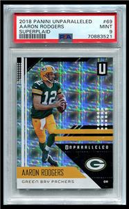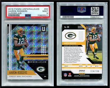 Your buying an AARON RODGERS 2018 Panini Unparalleled Superplaid #114/150 PSA 9 Pop 1 none higher (as of 02/19/2023) . Look for my slabbed Manning, Brady,Rodgers, and Brees in my auctions and eBay store. Try getting one to Gem- good luck !! I also have a ton of low pop Prizm, Prestige, and Elite items in my store . Plastic is never perfect, and pics are as good as I can get them.