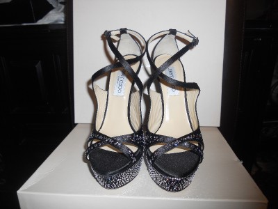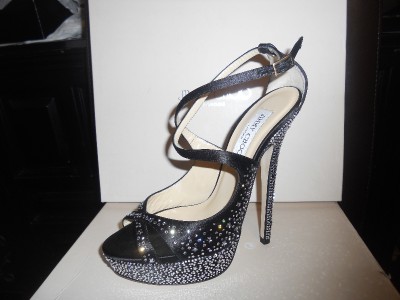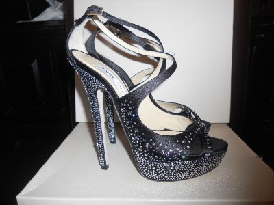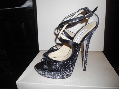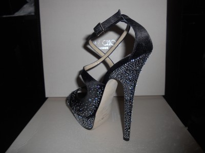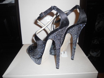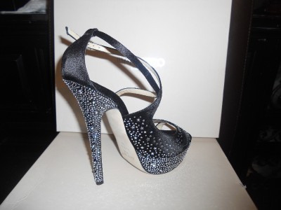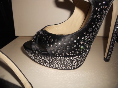 Step out for a night on the town wearing this exquisite criss cross sandals with twinkling crystals highlighting the platform, sides, criss cross straps over toe and stiletto heel. Black satin with allover crystal detailing. Self-covered 1" platform and 6" stiletto heel. Creamy leather lining and sole. Made in Italy. Color: Black.