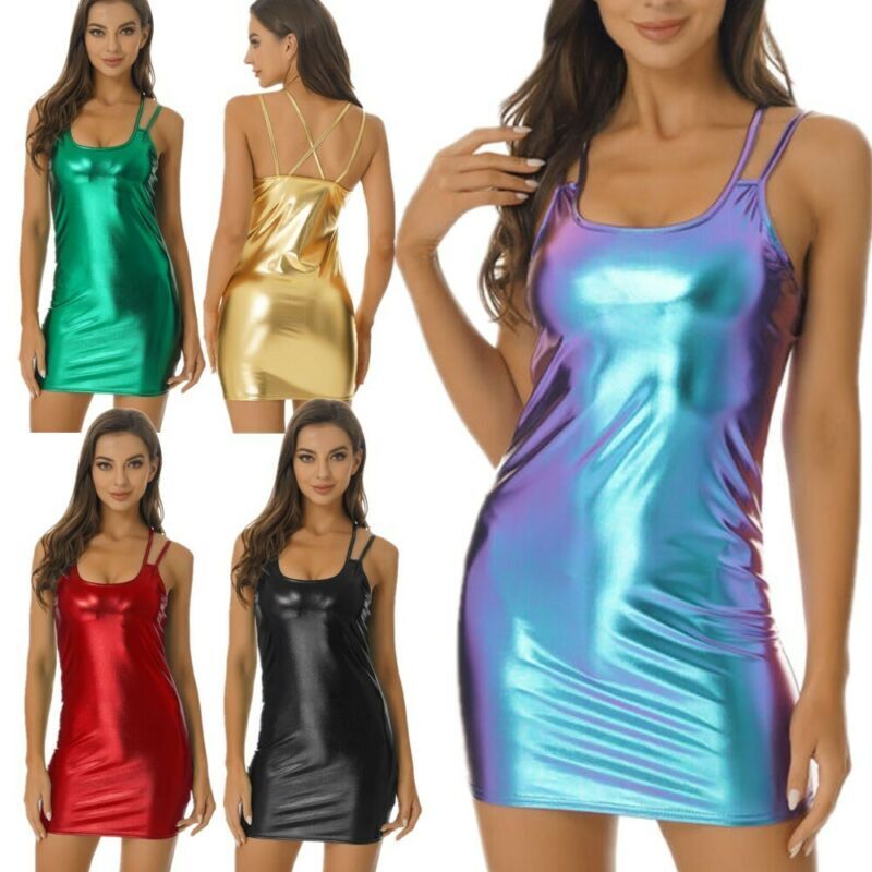 DE iEFiEL Damen Wetlook Minikleid Bodycon Glänzend Kurz Tanzkleid Nachtwäsche