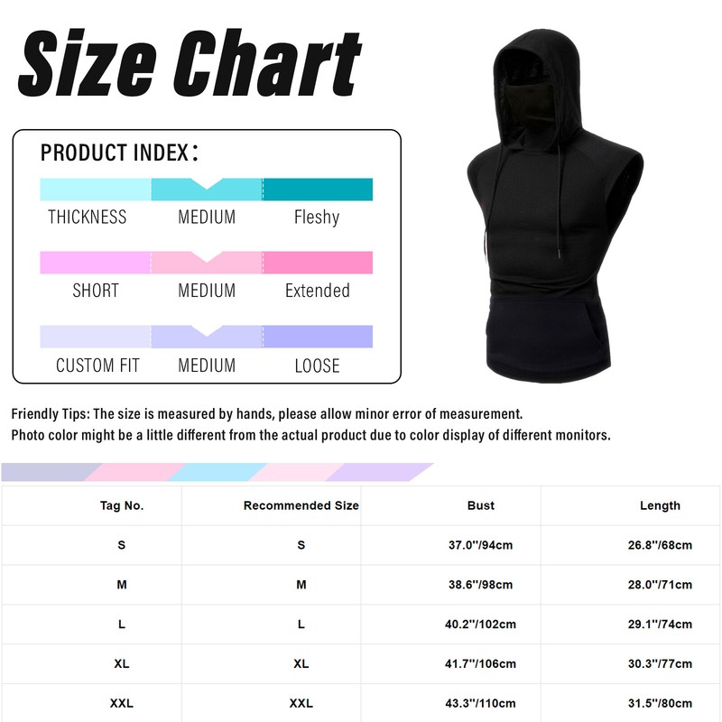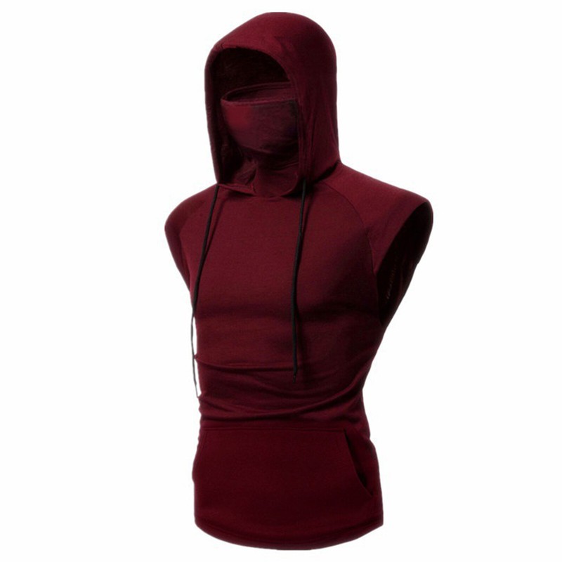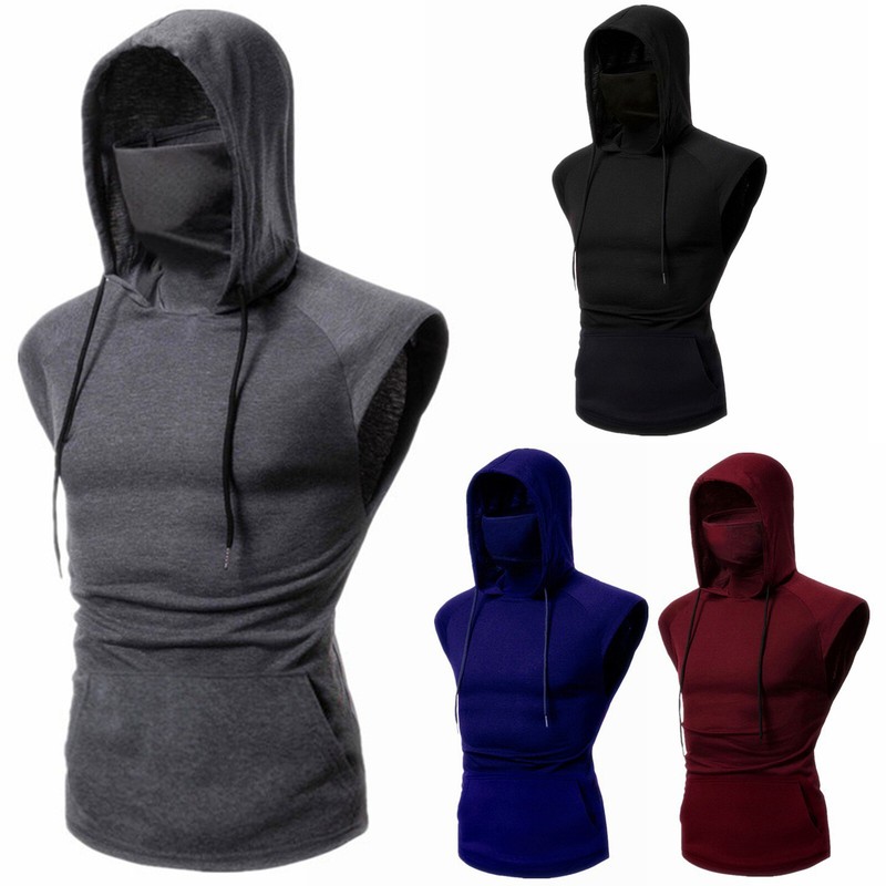 Men Casual Clothing Sleeveless Hoodie Style with Mask Drawstring Big Pockets Pullover Sport Tank Tops.