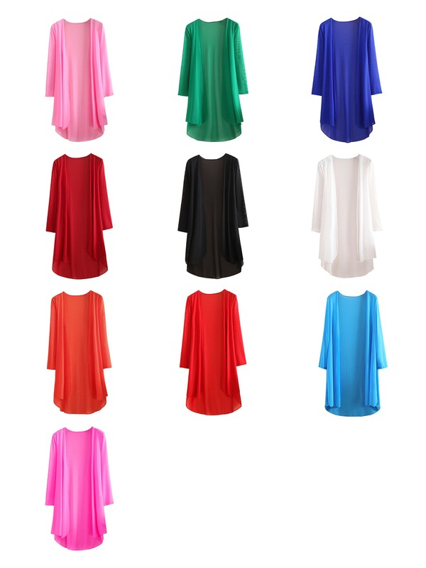 Women pure color chiffon plus size cardigan 3/4 sleeve open front high-low curved hem long shrug bolero for casual dresses.