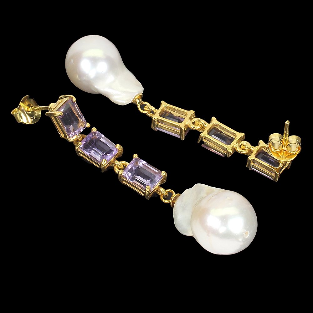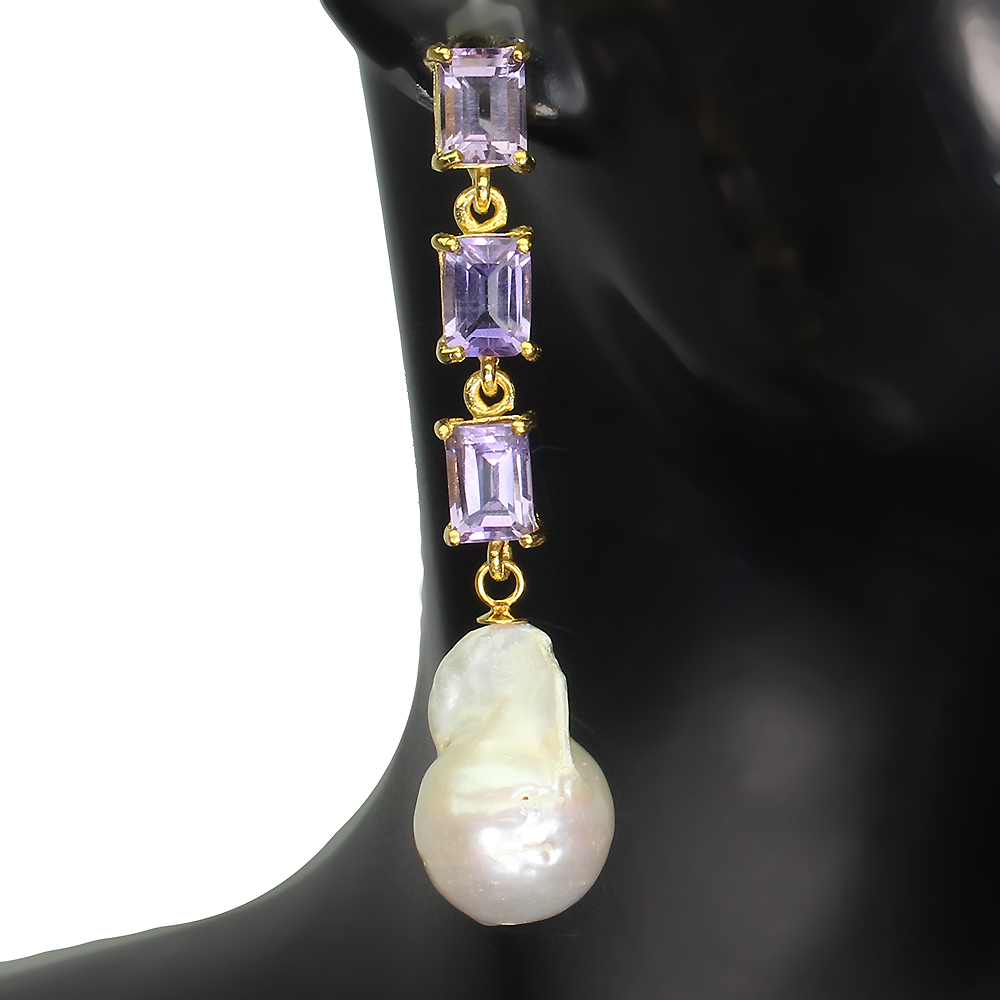 Unheated Octagon Purple Amethyst 7x5mm Pearl 925 Sterling Silver Earrings