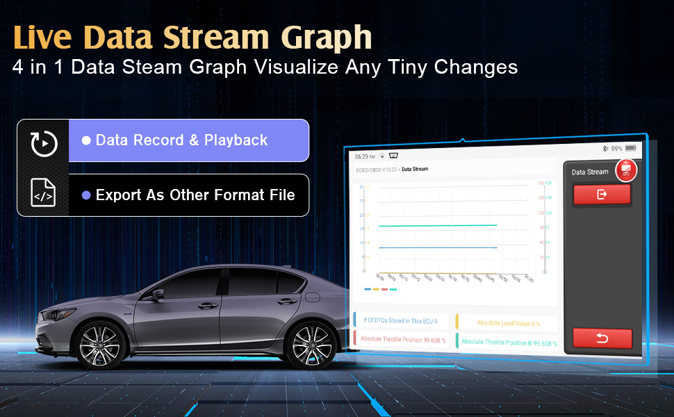 Anzeige des Live-Datenstroms in Text- oder Grafikform, z. B. Getriebeöltemperatur, Kraftstofftrimmung, ATF-Temperatur, Zylinderausgleichsraten, Motordrehzahl, O2-Sensoren, Luftmassenmesserdaten, Kraftstoffdruck, tatsächliche Kraftstofftemperatur im Vergleich zur gewünschten Kraftstofftemperatur usw;