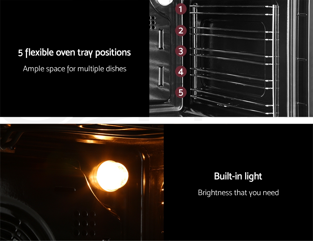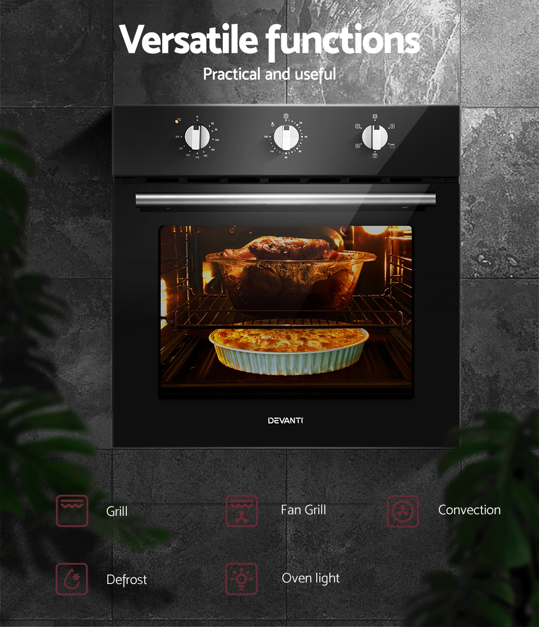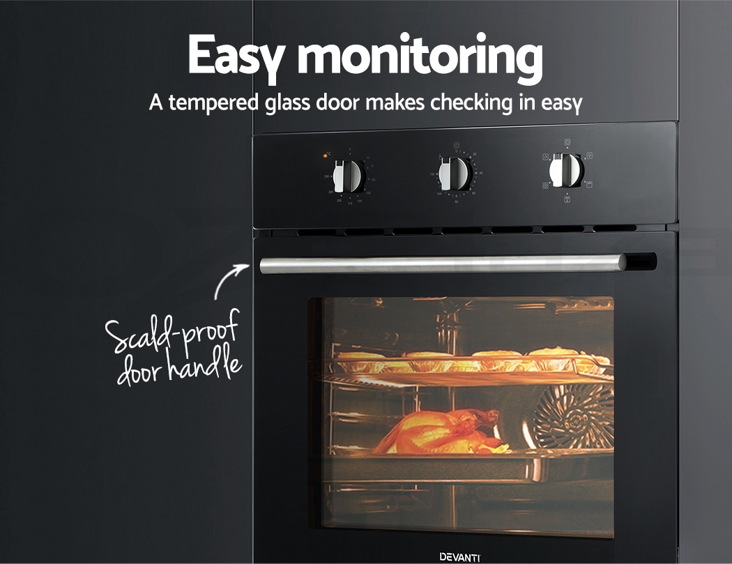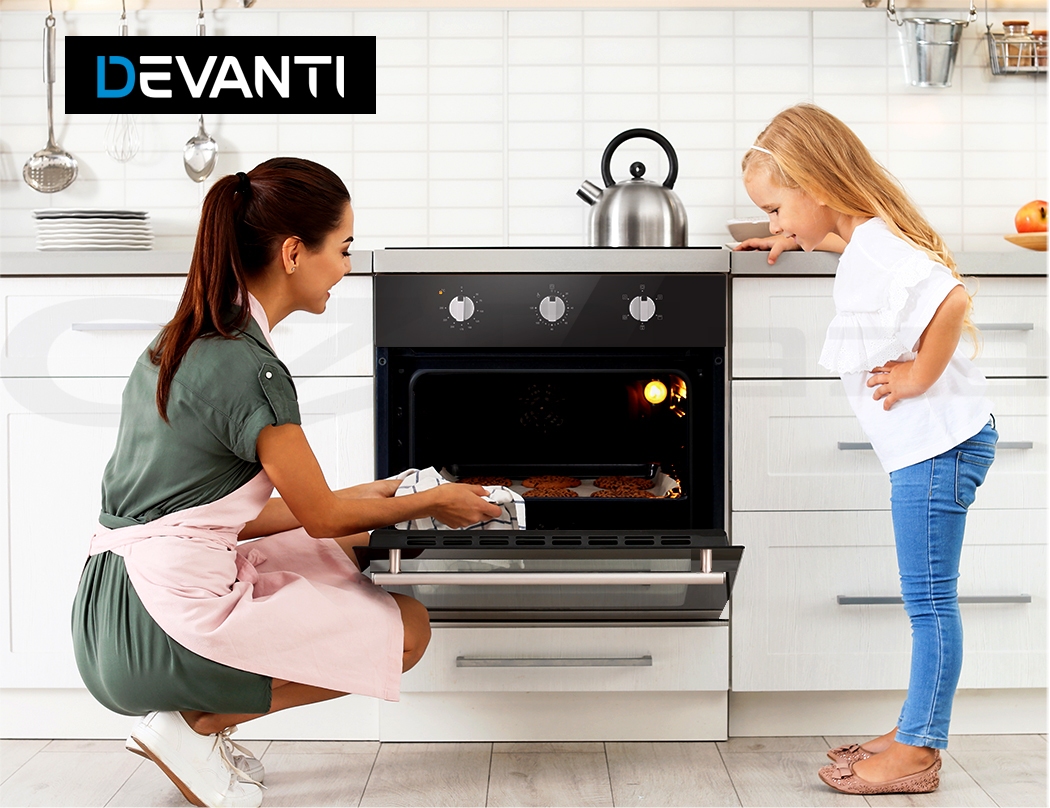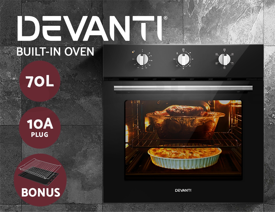 The Devanti 70L Built-in Oven is a must-have for any kitchen. With its large capacity and a variety of unique, useful functions, you'll be able to cook a full range of amazing dishes to impress friends and family. Made from tough food-grade stainless steel, a rust and corrosion-resistant internal enamel coating and durable tempered glass, our oven will withstand even the toughest of cooks. Removable trays can be reconfigured into 5 flexible positions. It has 5 auto-cooking modes, a 120-minute timer, automatic shut-off, a cool touch handle and a built-in light, so you can control every aspect of cooking from beginning to end. Easy to operate and even easier to clean, the Devanti Built-in Oven is your essential cooking companion.