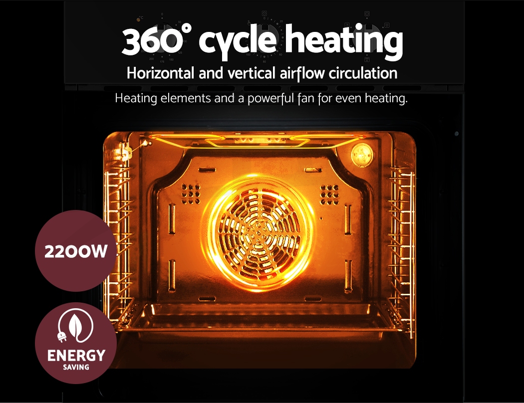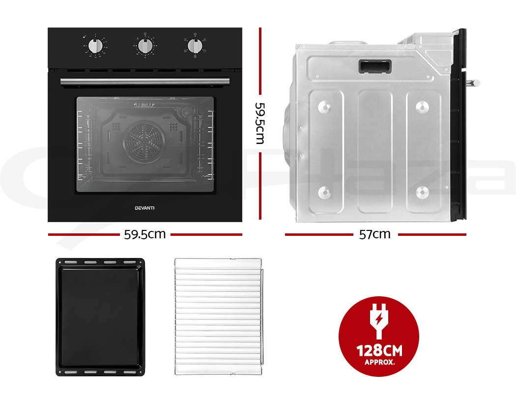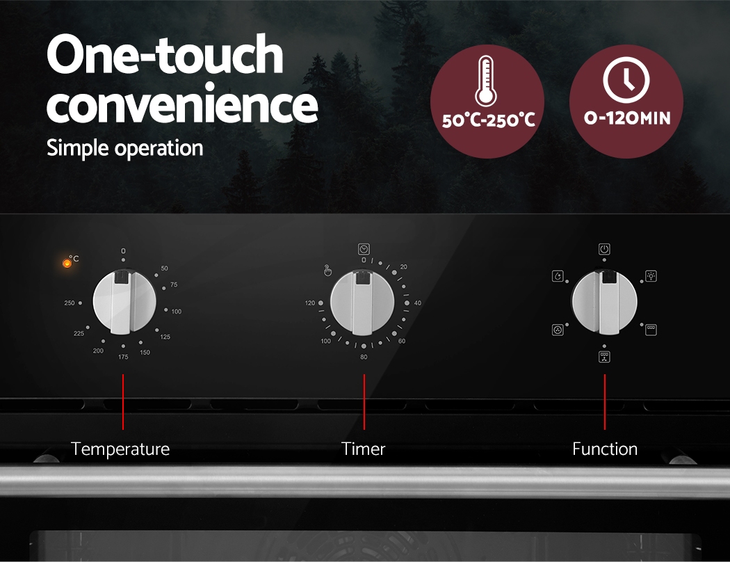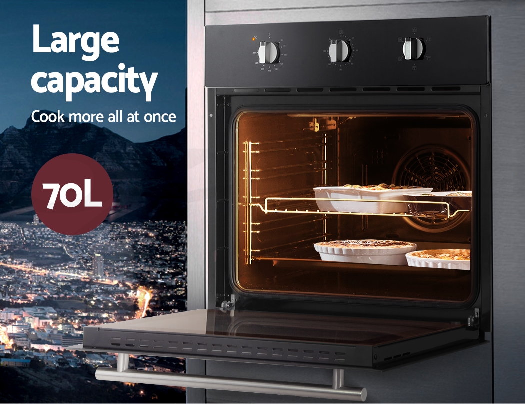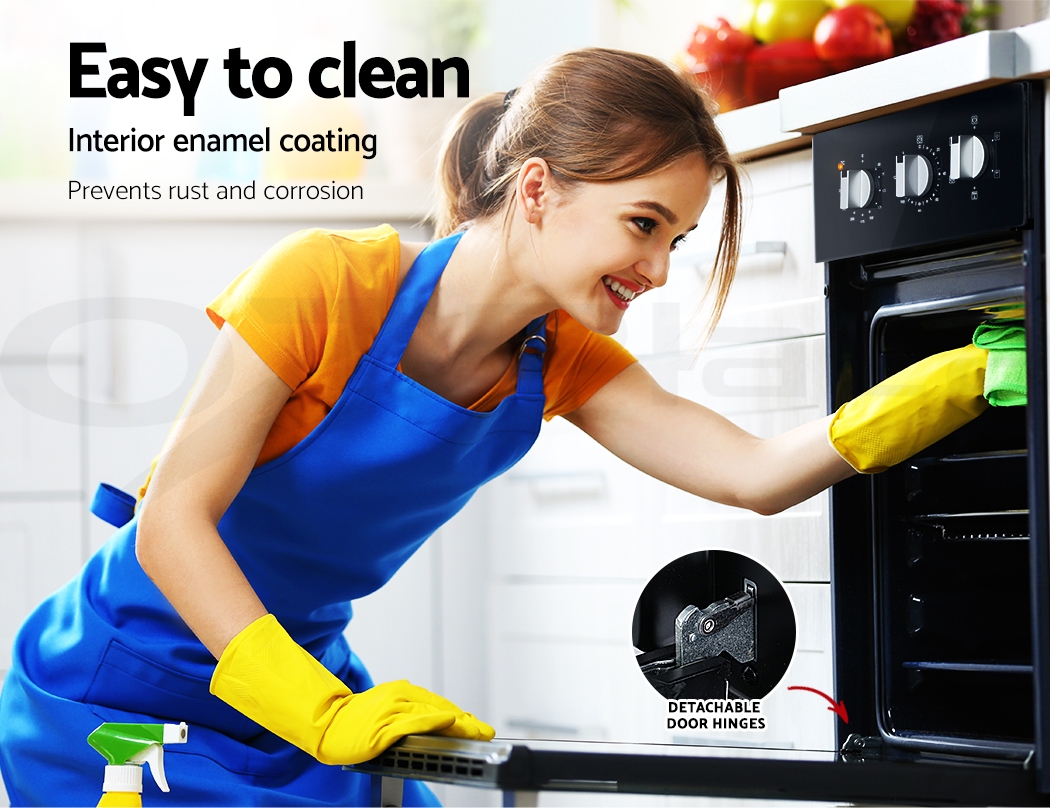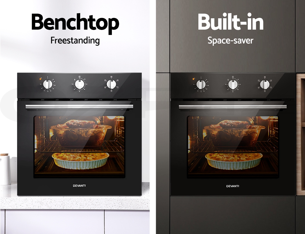 The Devanti 70L Built-in Oven is a must-have for any kitchen. With its large capacity and a variety of unique, useful functions, you'll be able to cook a full range of amazing dishes to impress friends and family. Made from tough food-grade stainless steel, a rust and corrosion-resistant internal enamel coating and durable tempered glass, our oven will withstand even the toughest of cooks. Removable trays can be reconfigured into 5 flexible positions. It has 5 auto-cooking modes, a 120-minute timer, automatic shut-off, a cool touch handle and a built-in light, so you can control every aspect of cooking from beginning to end. Easy to operate and even easier to clean, the Devanti Built-in Oven is your essential cooking companion.