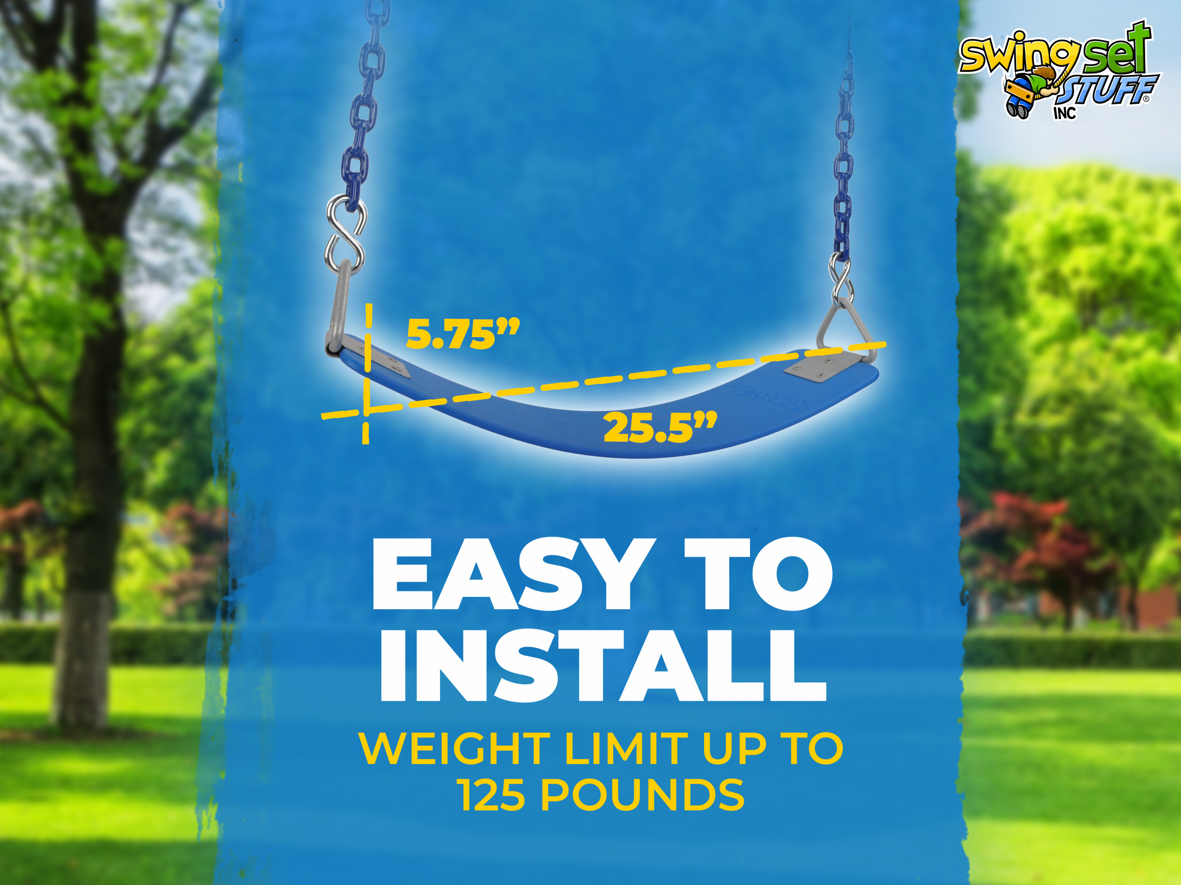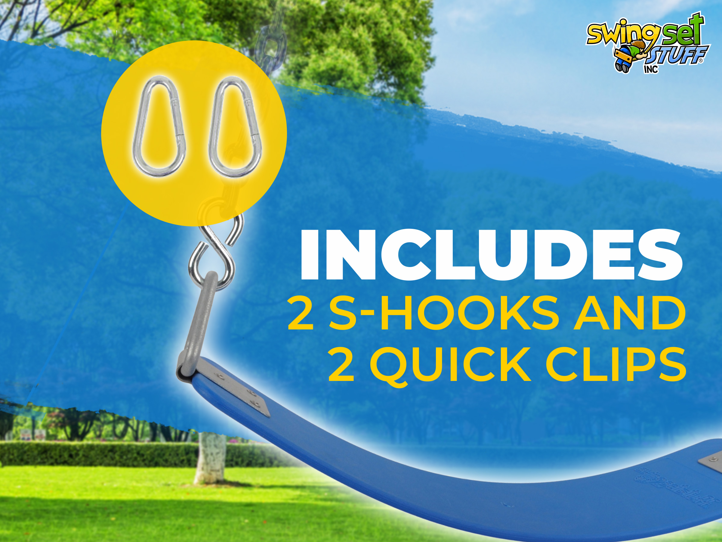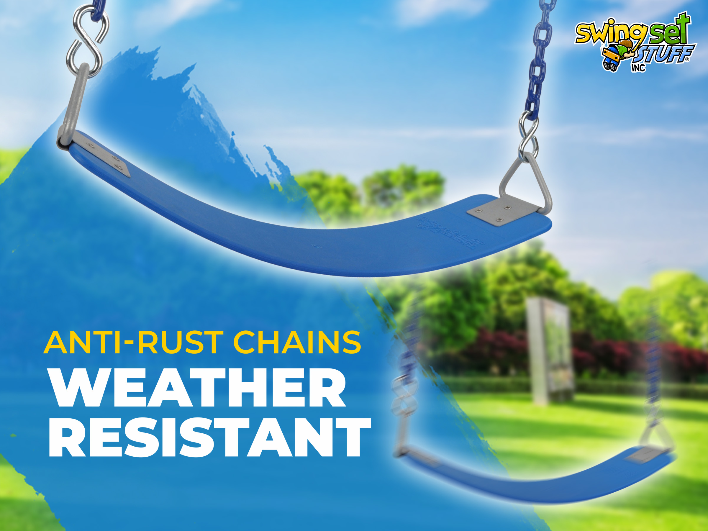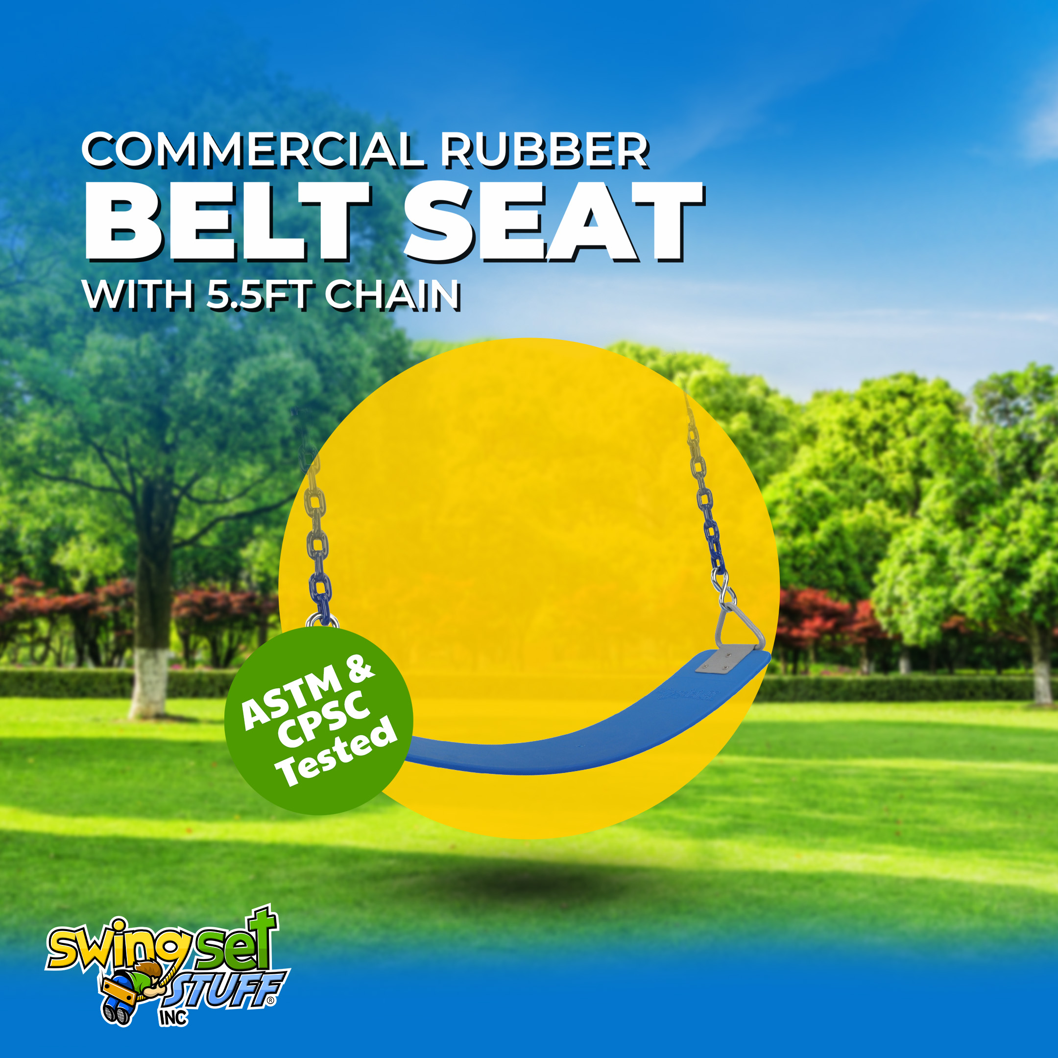 This Blue commercial rubber belt seat has 5.5 Ft. of coated chain attached with S-hooks. There is also a set of spring clips for easy attachment to swing hangers (not included).Chain is 3/16" in diameter.