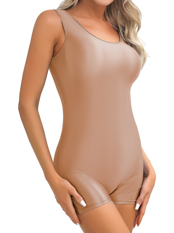 Sleeveless bodysuit, u neck, backless, glossy surface, solid color, high cut.