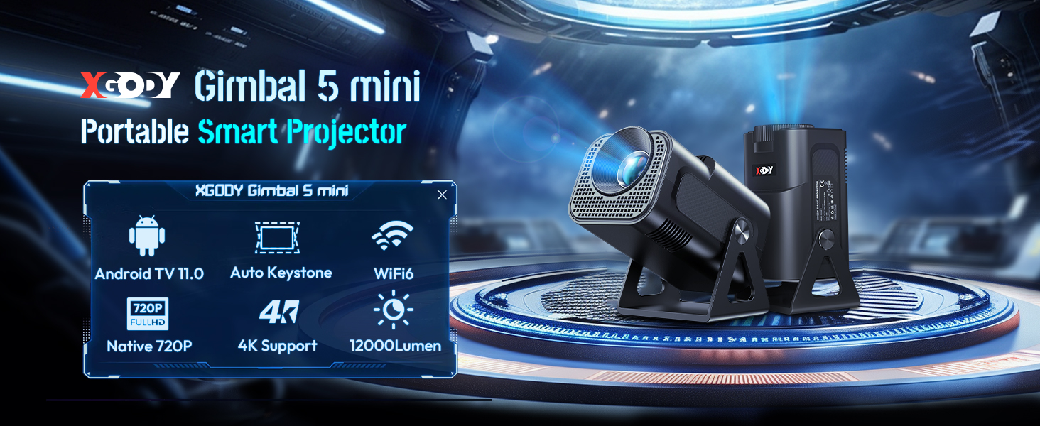 XGODY Gimbal 5 Mini Portable Projector equipped with latest 5G/2.4G dual band WiFi, with higher transmission rate and lower latency, a few seconds will be wirelessly synchronized to get a big screen. No additional adapter required. Built-in BT 5.0 chip, the projector allows you to connect the ideal Bluetooth speaker/headphone at any time and save every detail of the sound effect to offer you different sound scenes.