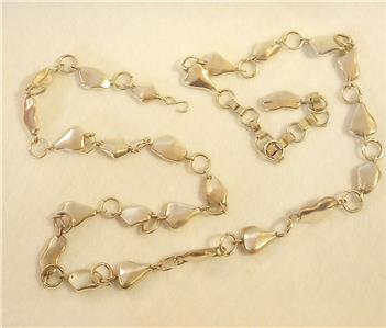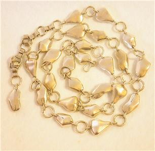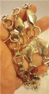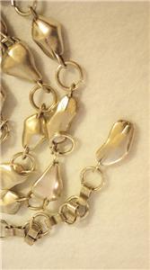 I'm unsure of the age of this fashion belt. It is very heavy and substantial and the silver finish is very bright and shiny. The oddball shapes of the components is very alluring. Some are shaped almost like beans, some maybe meant to look like shells. You can attach the hook where ever you wish so this will fit YOU. The excess amount will dangle down nicely. It is 44" long, about 1/2" wide and the pieces are about 1/3-1/2" thick. Great looking with black or to wear with a dress or pantsuit. Gives you a very polished high fashion look. See pictures.