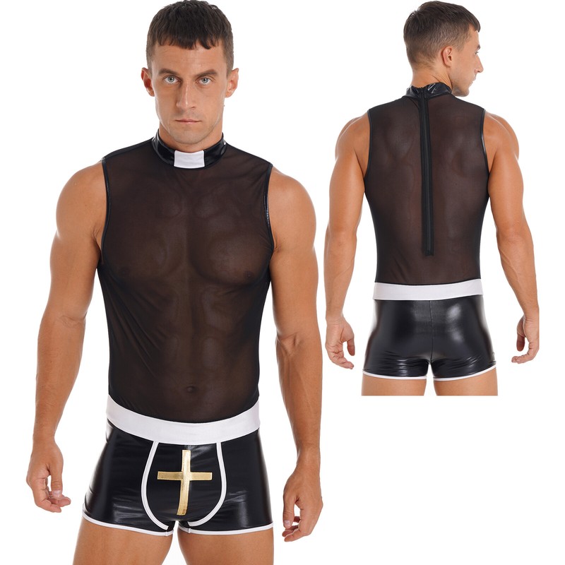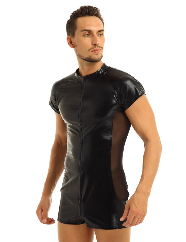 Men See-through Mesh Bulge Pouch Briefs Patent Leather Patchwork Thongs.