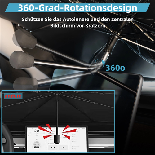 Zweitens, die einzigartige Idee - 360 Grad drehbarer und biegsamer Regenschirmknopf wird genommen. Die Schirmknöpfe der meisten Auto-Sonnenschirme können nicht um 360 Grad gedreht und gebogen werden. Der Schirmknopf unseres Auto-Sonnenschirms ist jedoch aus weichem Kunststoff und kann um 360 Grad drehbar und biegbar sein, was Ihren Auto-Mittelkonsolen-Bildschirm und das Armaturenbrett besser vor Kratzern schützt.