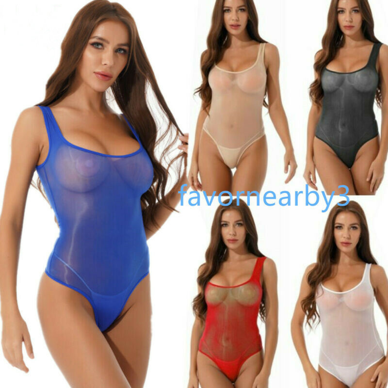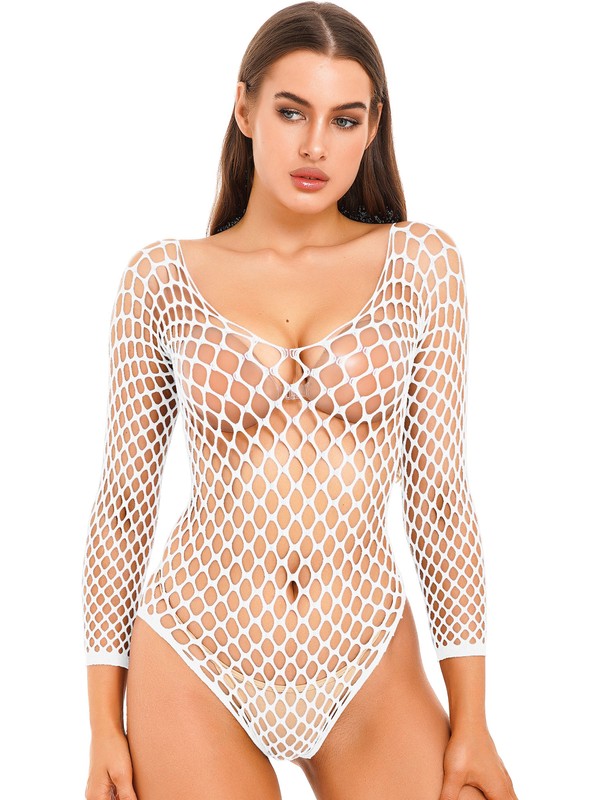 Womens Hollow Out Fishnet Long Sleeve Bodysuit Nightwear Scoop Neck High Cut Leotard.
