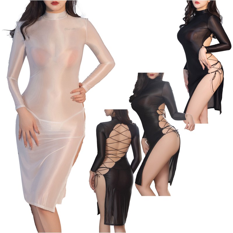 Mock neck with 2 press buttons closure, convenient to put on and take off. You can wear this dress as a nightwear or a clubwear.