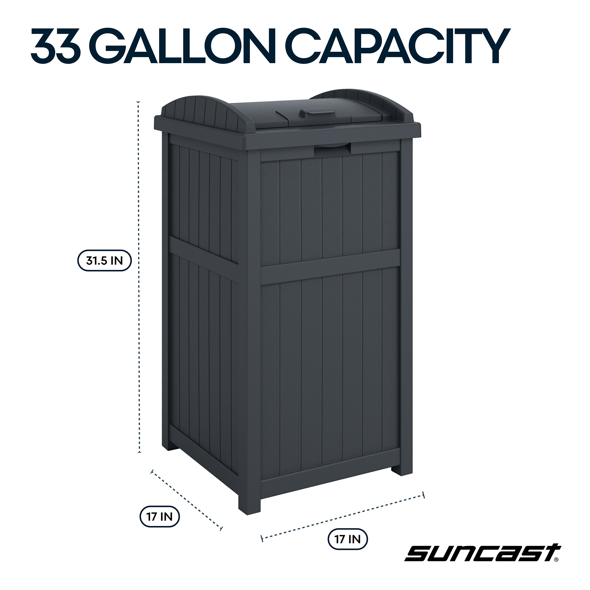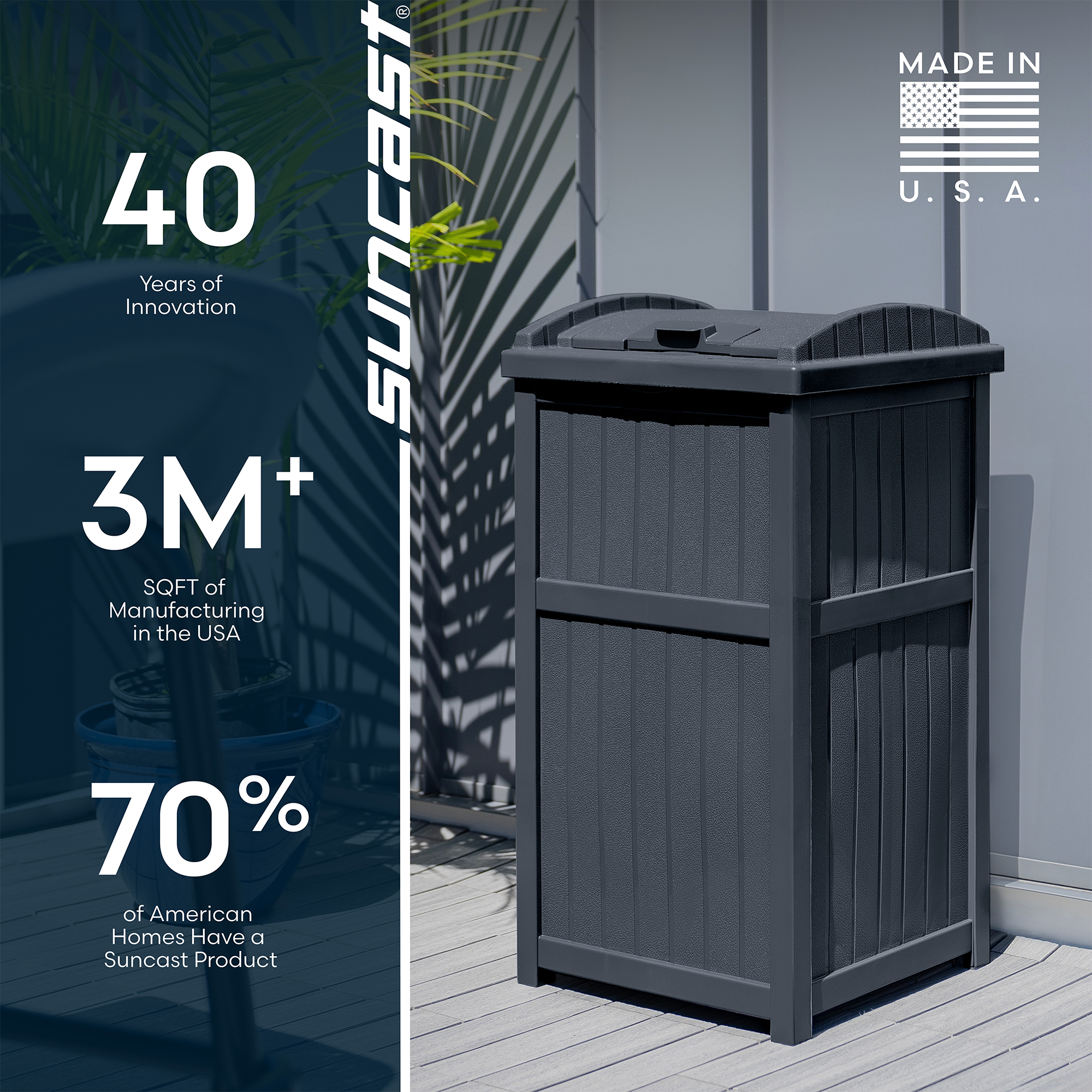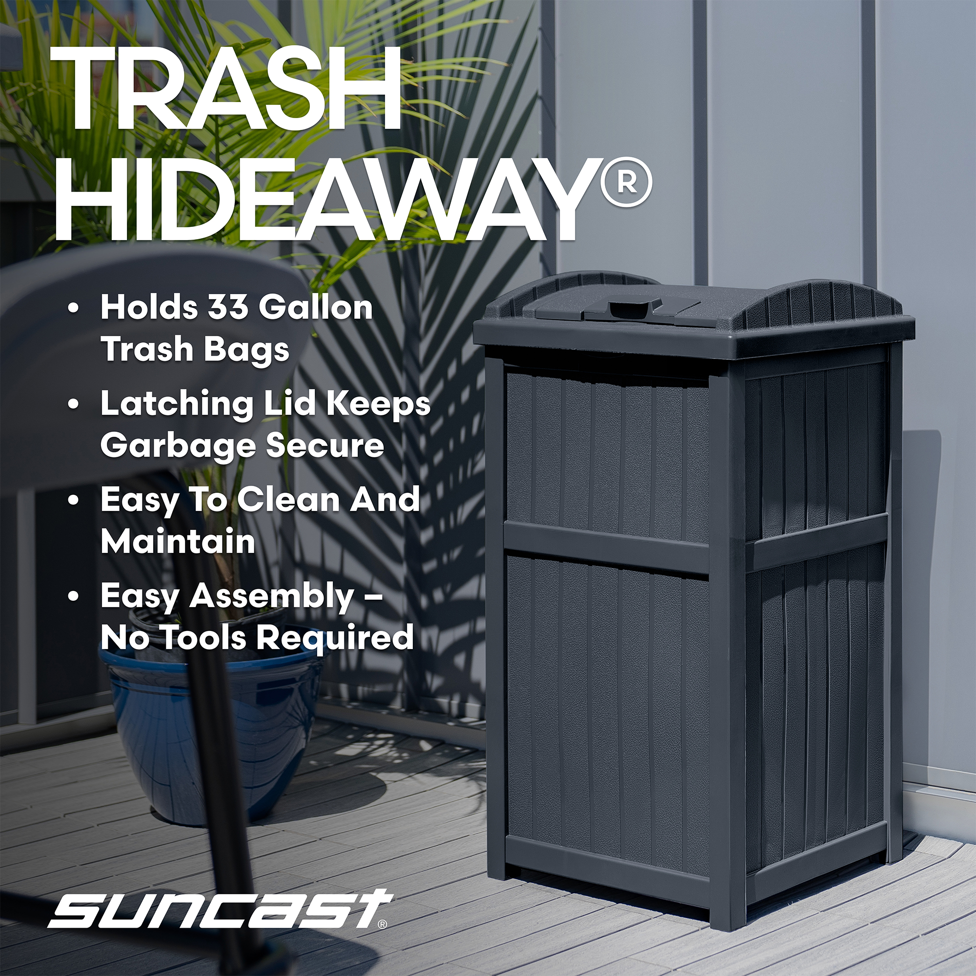 Use the Trash Hideaway Outdoor Patio 33-Gallon Trash Can from Suncast for a convenient way to throw away trash on your patio.
