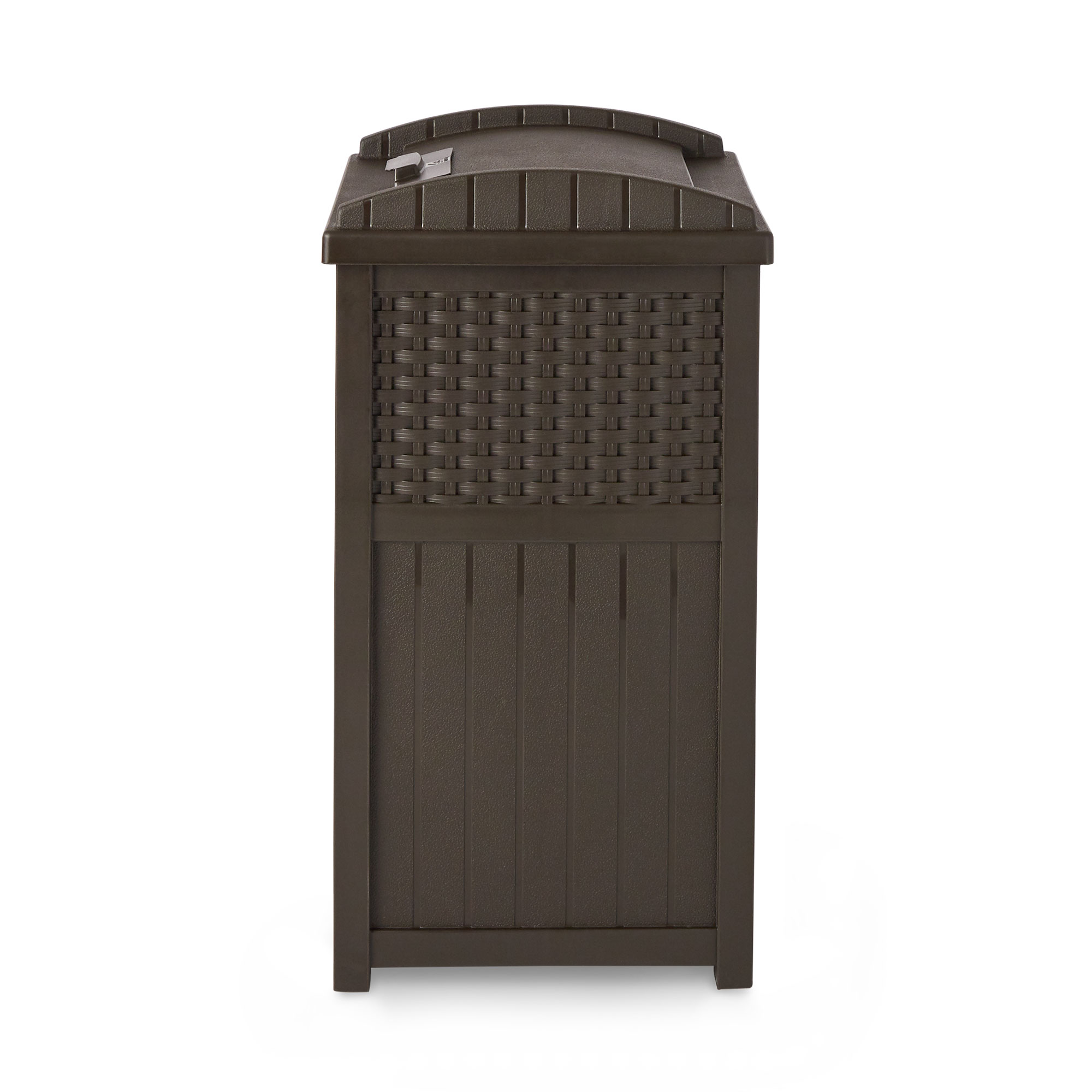 This Suncast outdoor trash hideaway has a stylish design that looks great on most patios or decks. The wicker design compliments most any patio furniture or home decor. This Suncast outdoor trash hideaway unit includes a latching lid and has a solid bottom panel, which keeps garbage from spilling out all over the patio or deck. Standard 30-33 gallon garbage bags fit perfectly inside this Suncast trash hideaway, so it's perfect for poolside areas, patios, and decks that get lots of use.
