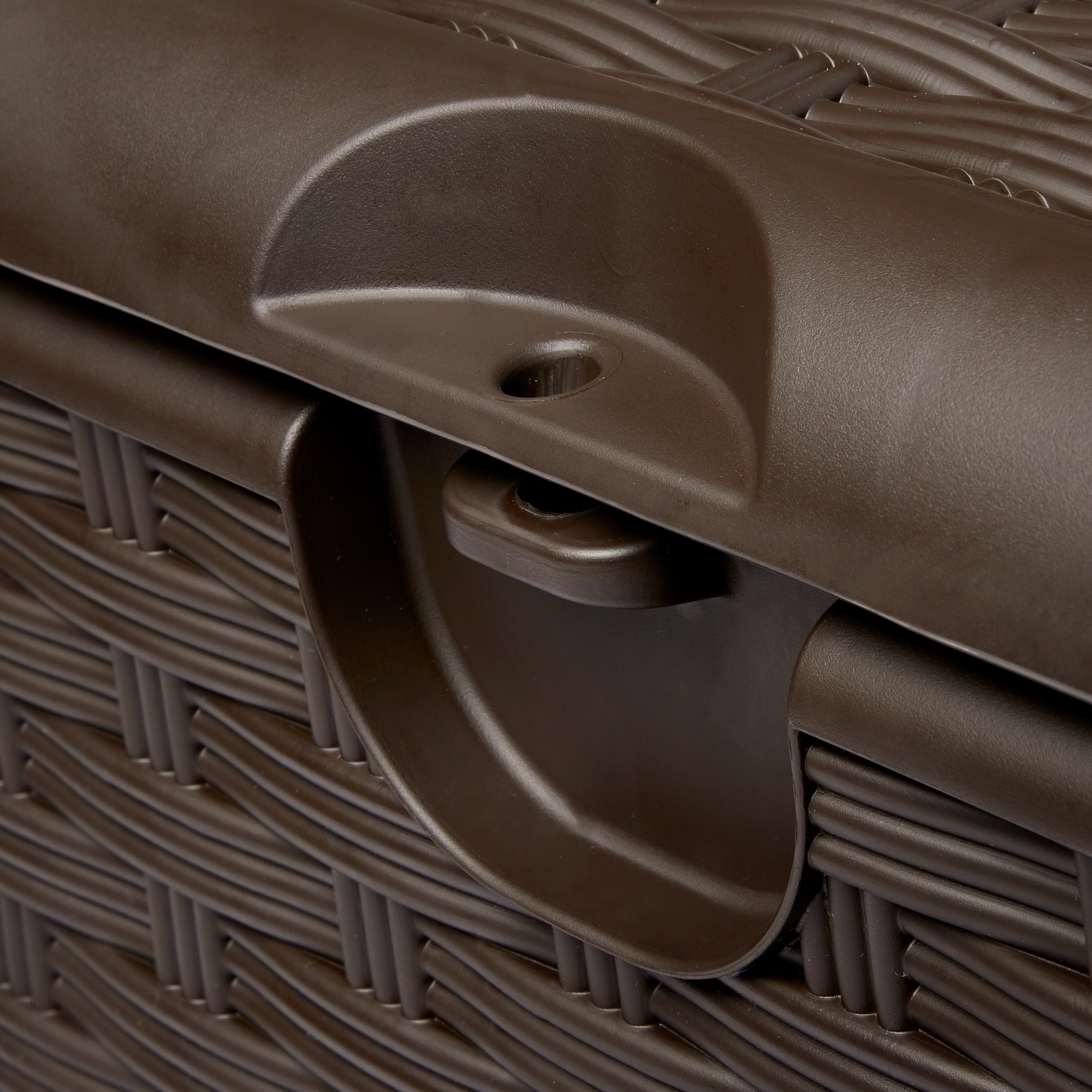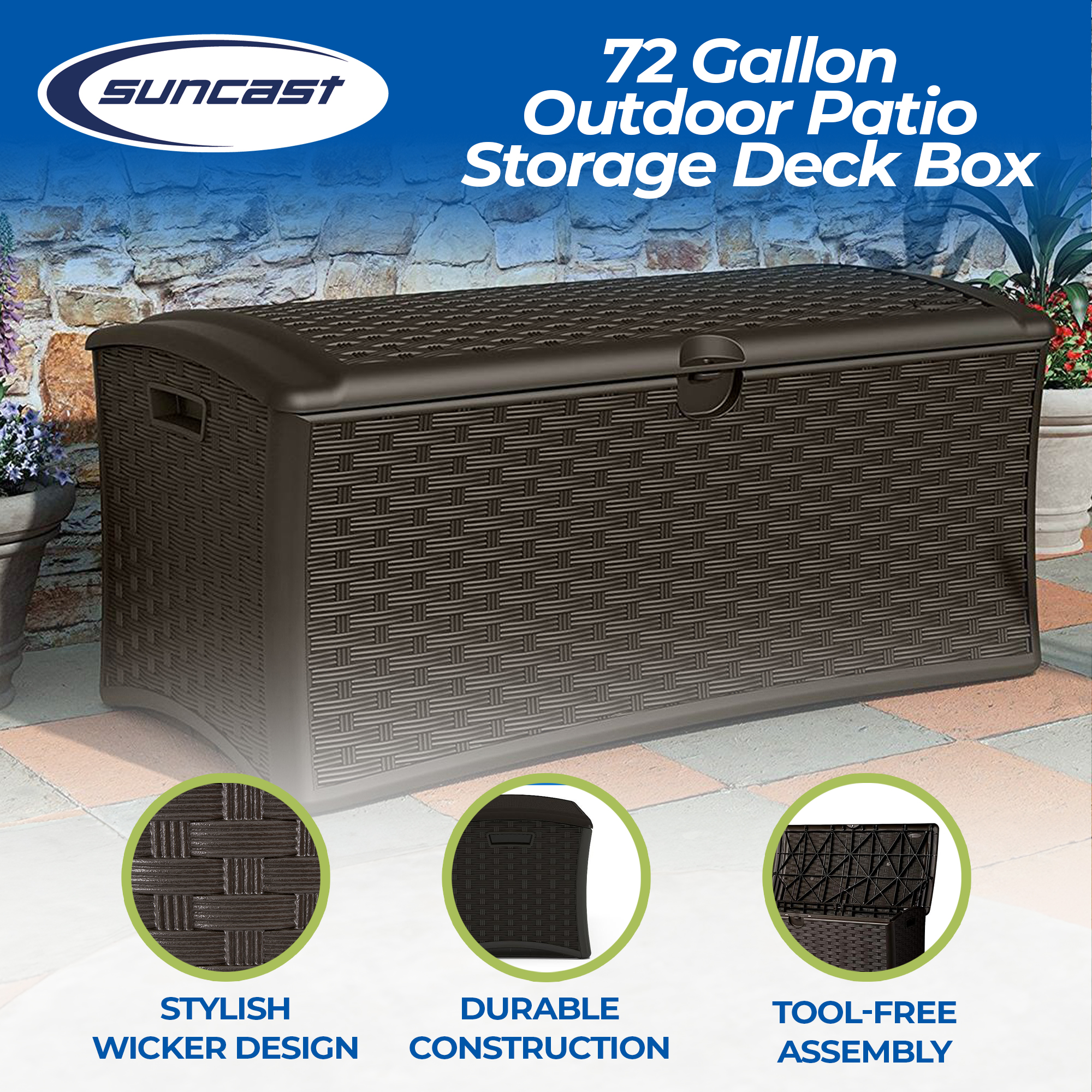 Bounteous outdoor storage space exists within the Suncast 72-Gallon Resin Wicker Deck Box. Molded with durable polypropylene plastic and featuring an attractive wicker-like facade, this patio storage bin is an affordable weatherproof solution for stashing seat cushions, grilling instruments, firewood, swimming pool accessories, gardening supplies or other outdoor accessories. This deck box is great for storing furniture cushions and outdoor accessories. The components snap into place without tools.The stylish wicker design blends well with patio furniture and home.