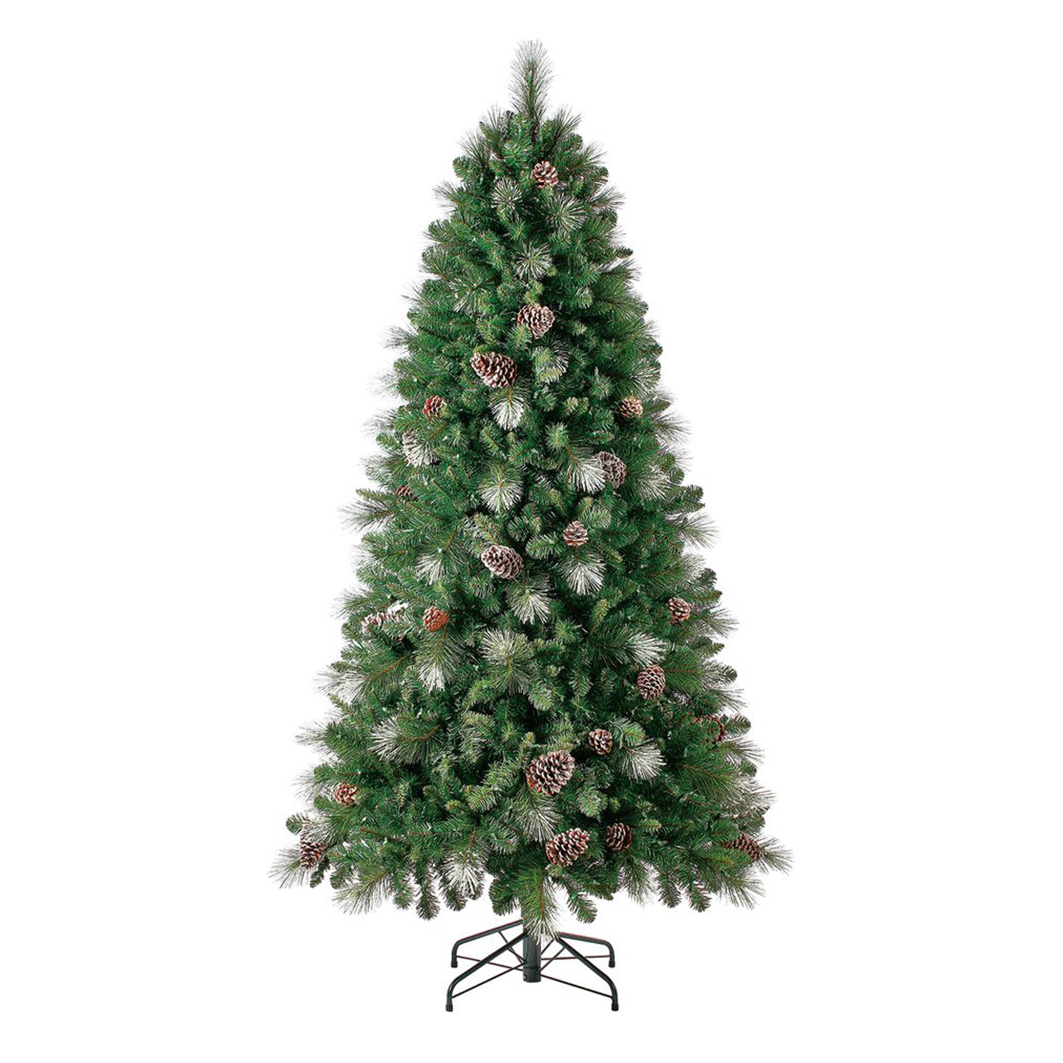 Bring the magic of the holidays home with the Home Heritage Lincoln Flocked Pine Pre-Lit Artificial Christmas Tree. Standing 7 feet, this medium-sized tree is designed to effortlessly infuse your living space with festive cheer. It's adorned with 1,381 lush foliage tips and a flocked finish with pinecones and glitter to create a stunning winter wonderland and evoke the charm of the fresh greenery without shedding needles.