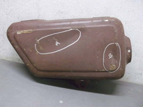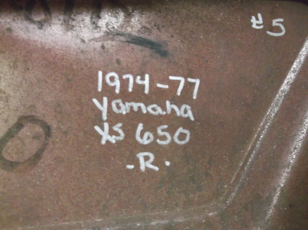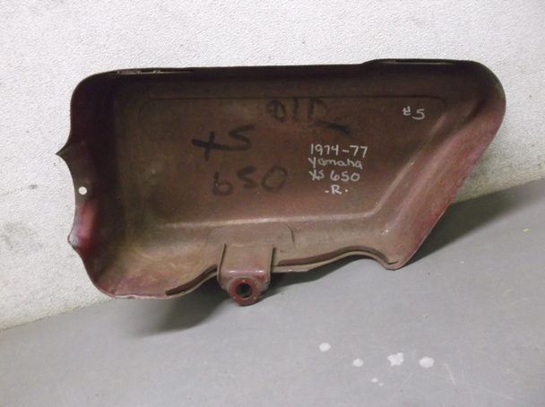 Used Right Side Cover for a 1974-1977 Yamaha XS650 The Product: A used right side cover for 1974-77 Yamaha XS650. Research: We are basing that this is what it fits by what was written on the inside of the side cover when we got it. It said "1974-77 Yamaha XS650" handwritten on it. We bought out another salvage yard in the area and they individually labeled each side cover. We think that the label is correct but we did not do any further research. Please look at the pictures closely and make sure your side cover is the same. Please note our return policy if the side cover is mislabeled. Layout of pictures: The first picture is of the front of the side cover. The second picture is of the back. The third picture is of the damage we found. The fourth photo is of another view. The fifth picture is of the handwritten label. Condition: It is used and dirty. It has been repainted. There are a few rust areas. A couple rust spots are on underside. In picture 1 the letters A and B indicate where there are dents. When you receive it and if it does not fit, it is returnable as outlined below. Please note that we did not label these but we think they are correct but if the other shop misidentified it, you can return it for the purchase price but you will pay all shipping charges to and from. So make sure this looks like your side cover before buying.