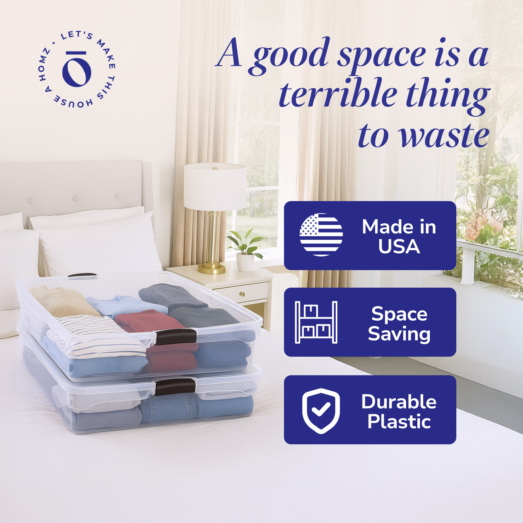 Tidy up the underneath of your bed and store away clutter with the Homz 56-Quart Underbed Clear Plastic Latching Storage Container 2 Pack. These under-bed clear storage containers are a great way to hide clutter and get additional storage space where you least expect it.