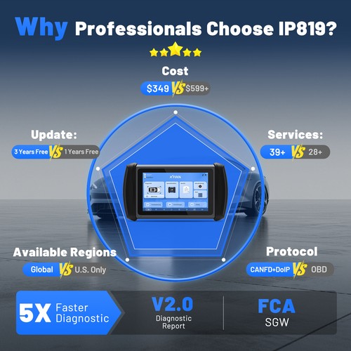 2025 Upgraded Ver of D7 Scan Tool: XTOOL IP819 ECU Coding tool (Upgraded Version of D7.) is deisgned to max up the capabilities of your vehicles, reset adaptiva data, match/relearn replaced ECUs, etc. It has all all functions of D7. In addition, compatible with renowned models for BENZ, for Mitsubishi. Empowers you to reflash hidden features, deactive annoying functions and code retrofitted components for peak performance. Features Programmable Module Installation(PMI) to program new modules quickly and correctly for Ford/for LincolinAdvanced Hardware Configuration:☑️2+64GB Storage ☑️4-Core 1.8Ghz ☑️Android 10.0 OS ☑️ 5000mAh Battery,Type-c Support Fast Charging ☑️7'inch Screen Display ☑️1024*600 Resolution