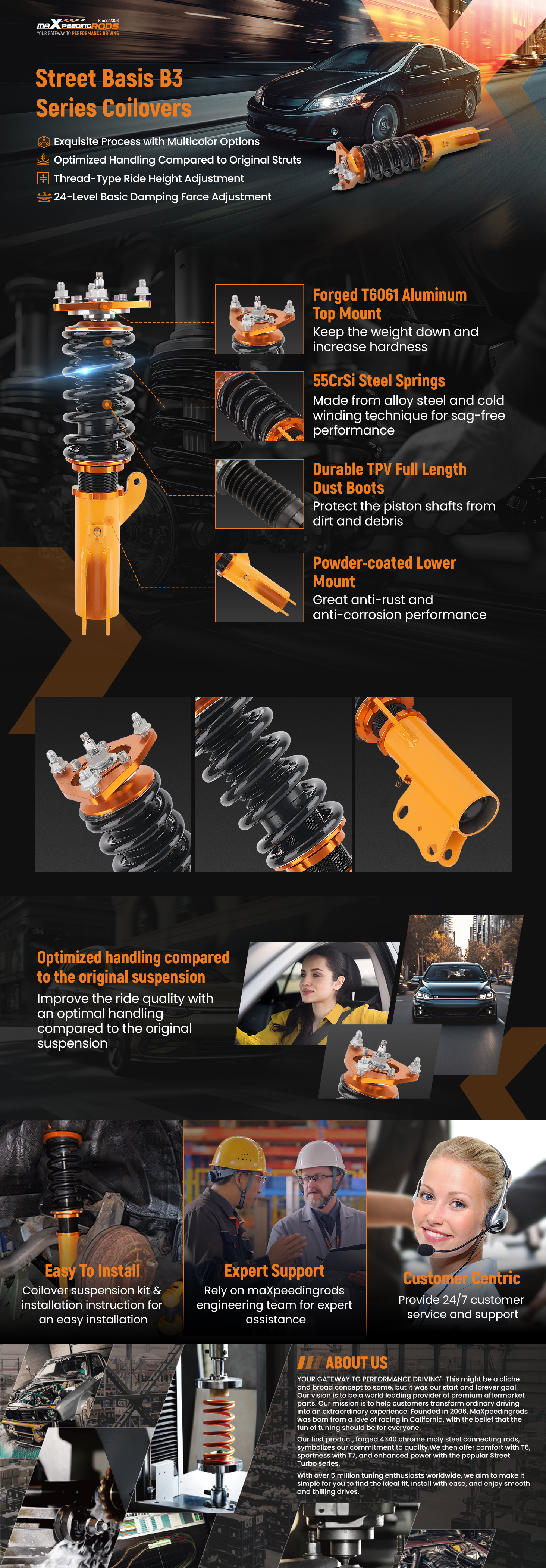 12.A 24 rebound dampening adjustment level allows you the ability to perfectly dial in your coilover setup. You will experience better ride quality in all road conditions.