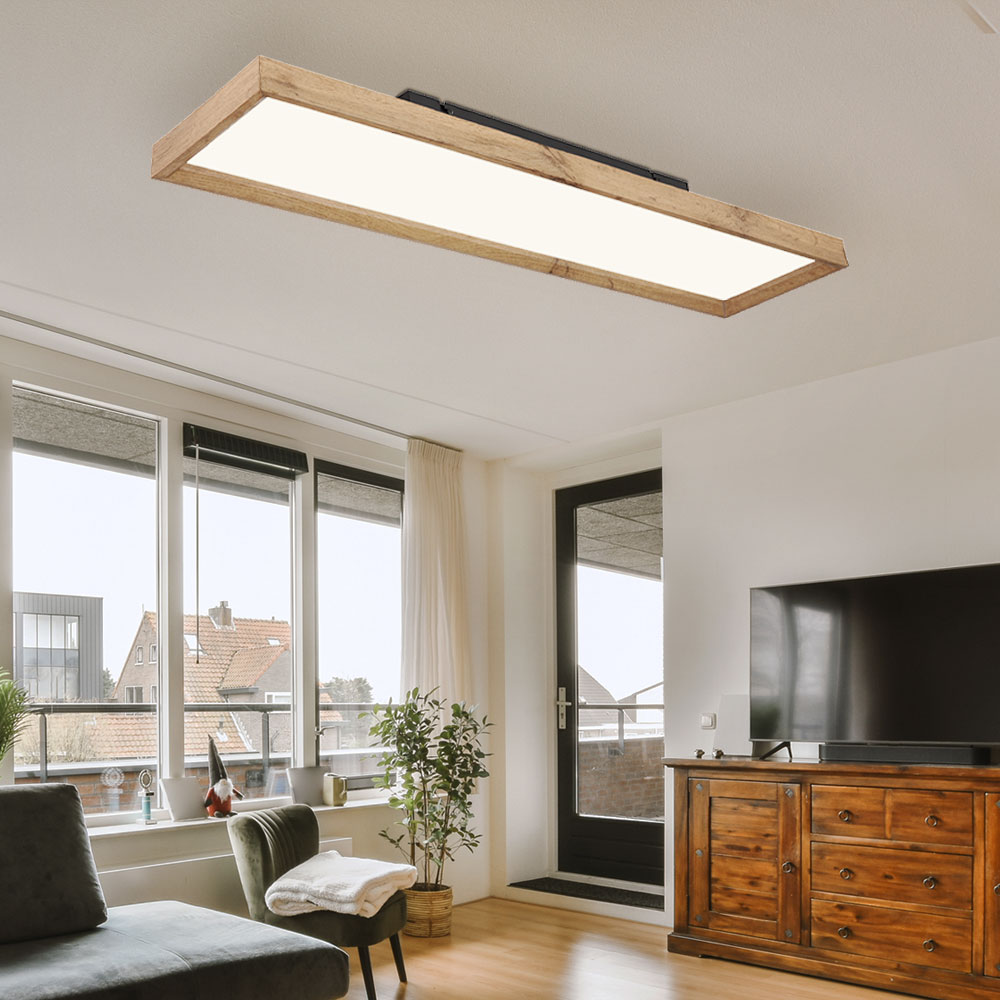 Diese rechteckige Deckenleuchte (80x20cm) in Holzoptik begeistert durch ihr tolles Design. Im Rahmen der Leuchte befindet sich eine LED Platine welche in den Lichtstufen 2700 Kelvin warmweiß, 4500 Kelvin neutral und 6500 Kelvin kaltweiß fixiert werden kann.