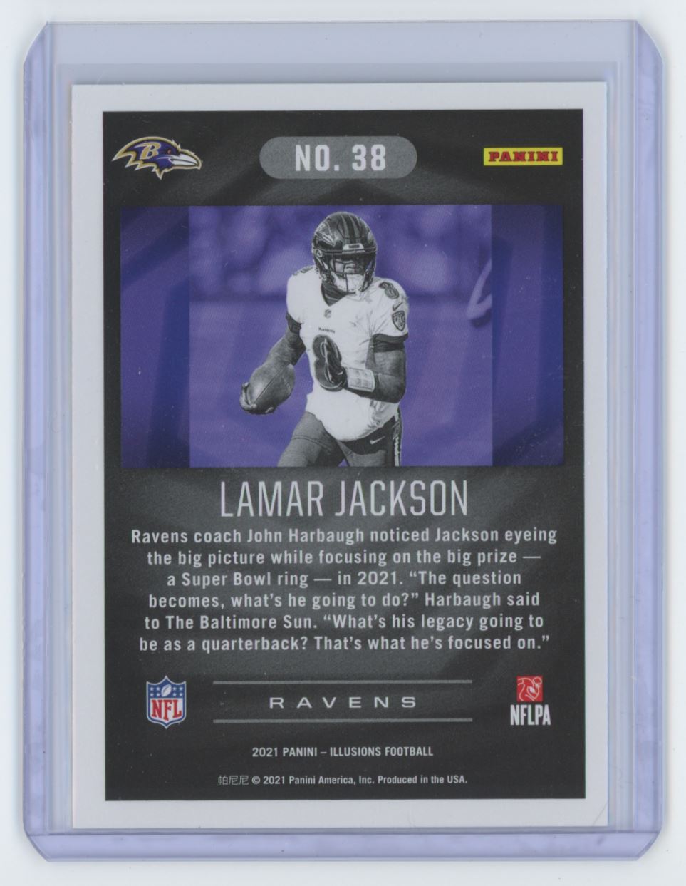 | Description: | Lamar Jackson | | Category: | Football | | Year: | 2021 | | Product: | Panini Illusions | | Team: | Football Card | | Card Number: | 38 | | Dimensions: | 4" x 3" |