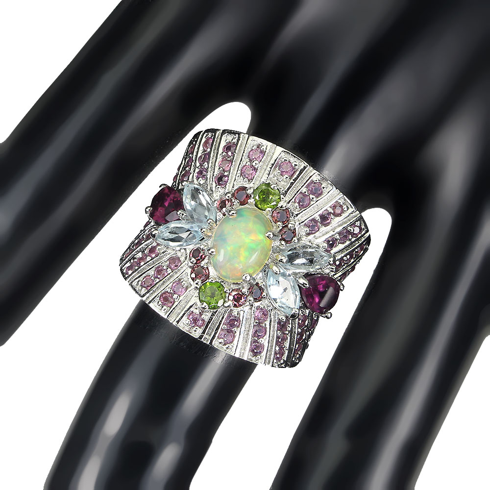 Unheated Oval Fire Opal 8x6mm Aquamarine Rhodolite Gems 925 Sterling Silver Ring