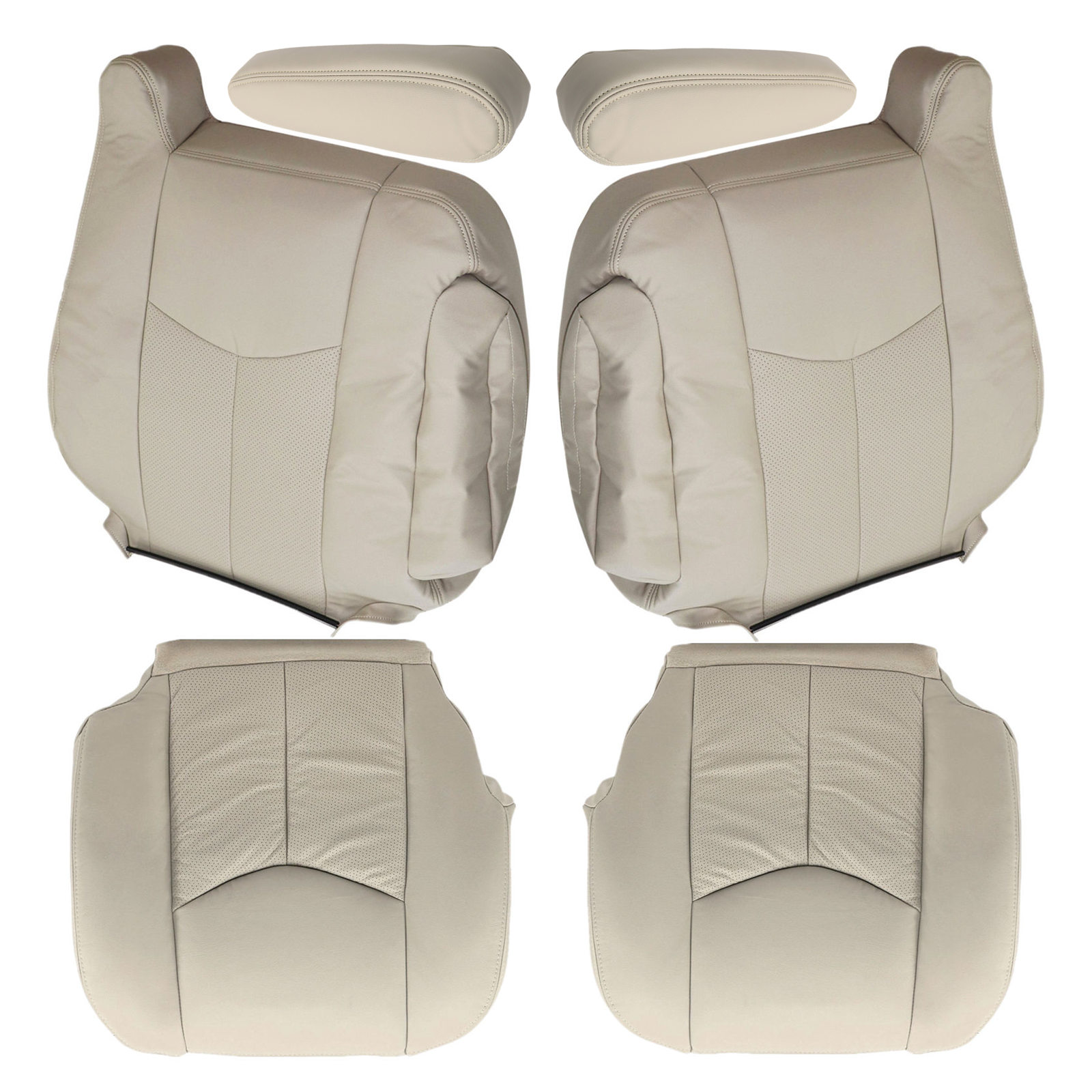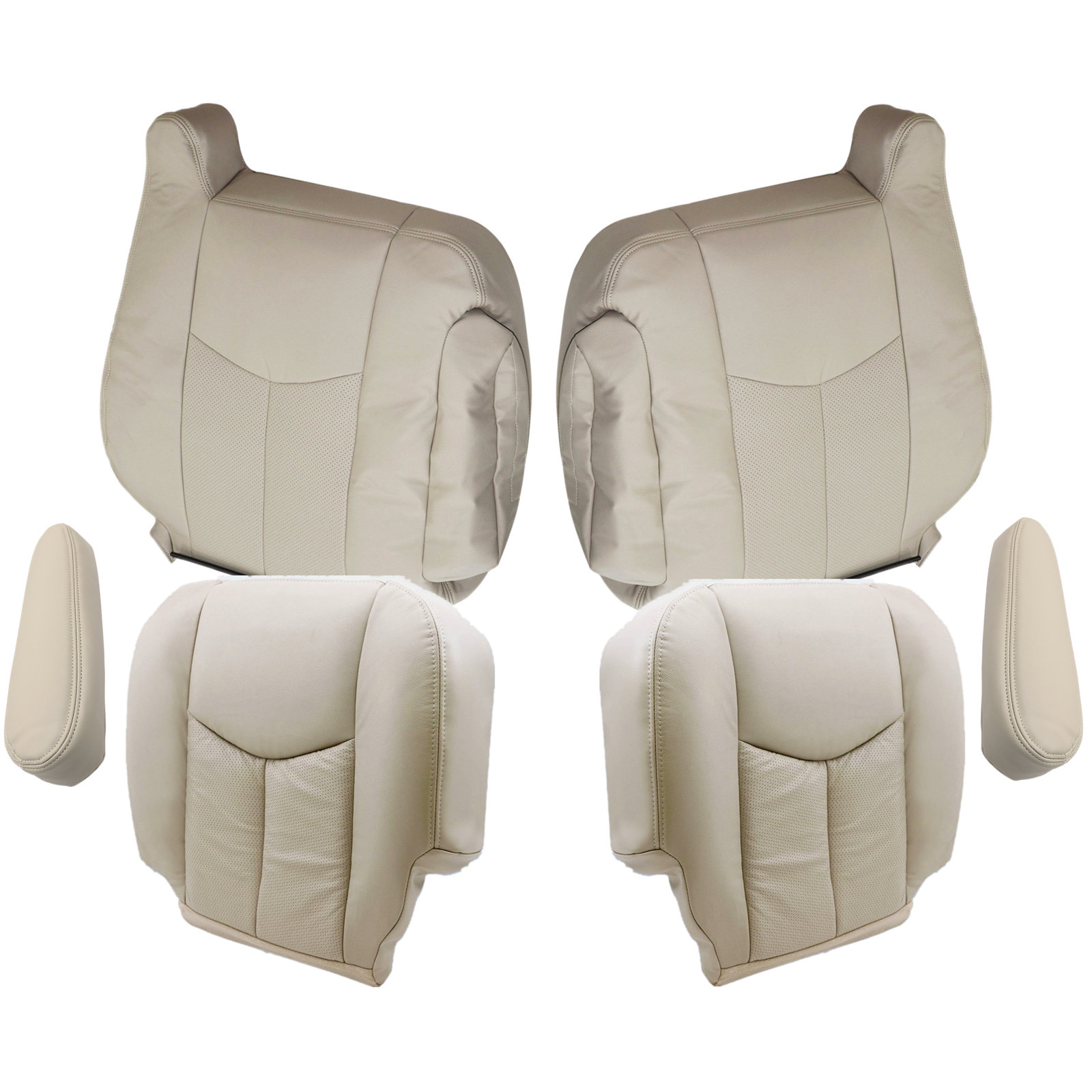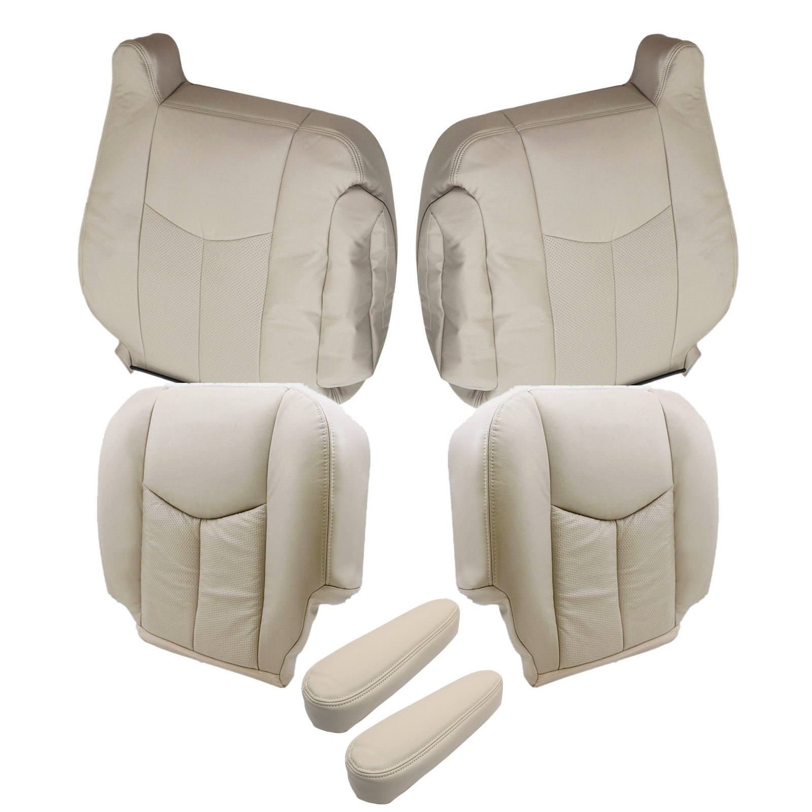 For 2003 2004 2005 2006 Cadillac Escalade Driver & Passenger Bottom-Top Replacement Perforated Leather Seat Cover & Armrest Cover Shale Light Neutral Tan #152