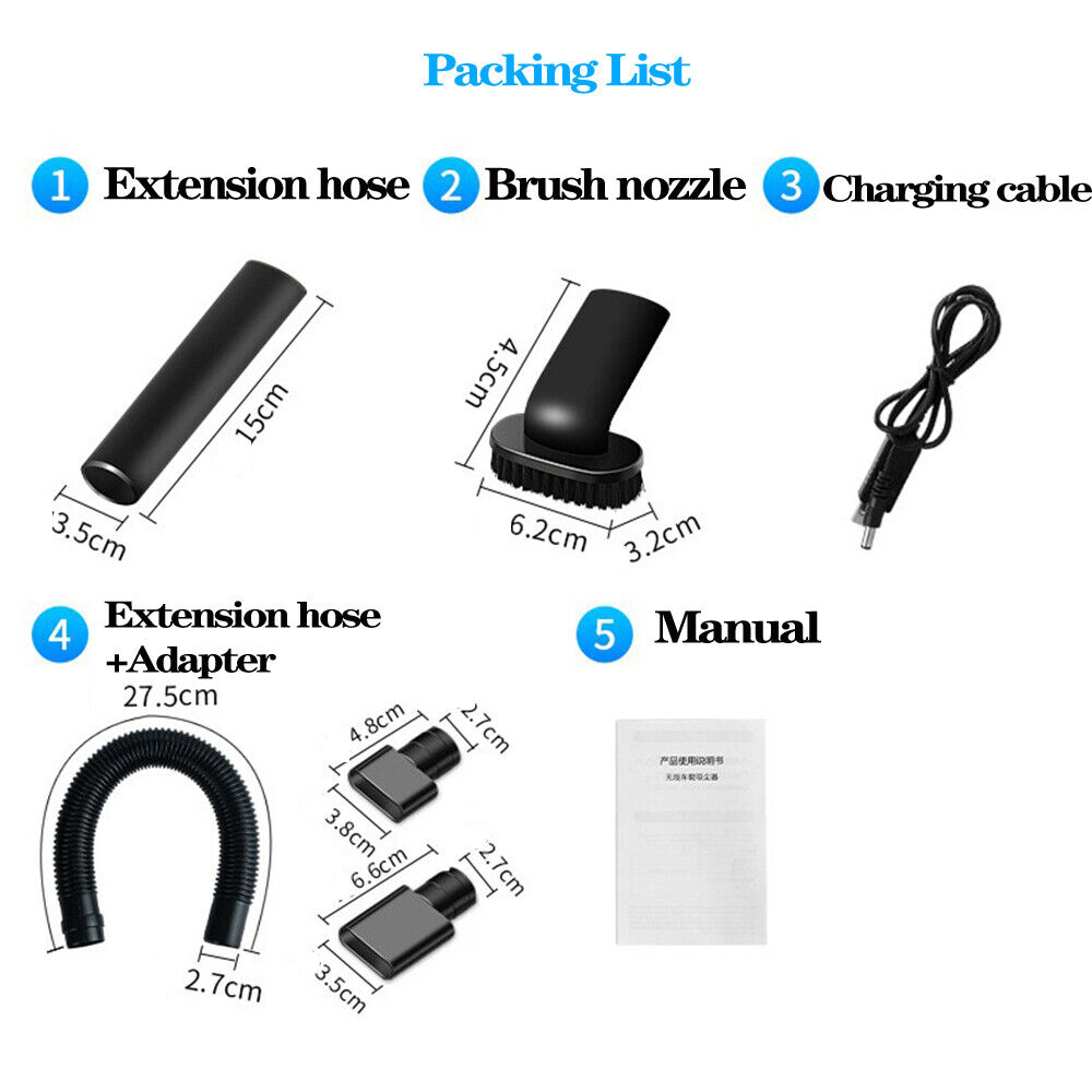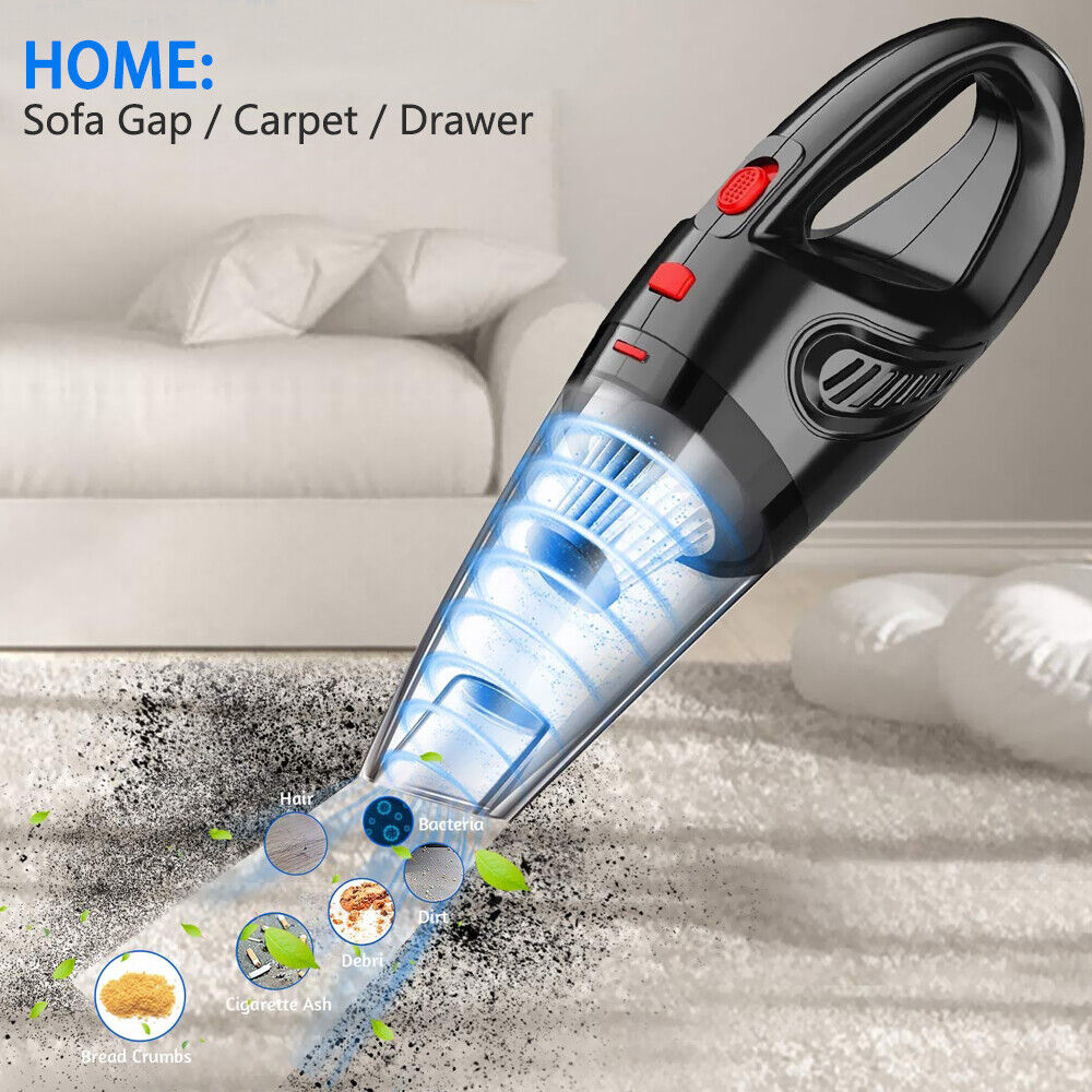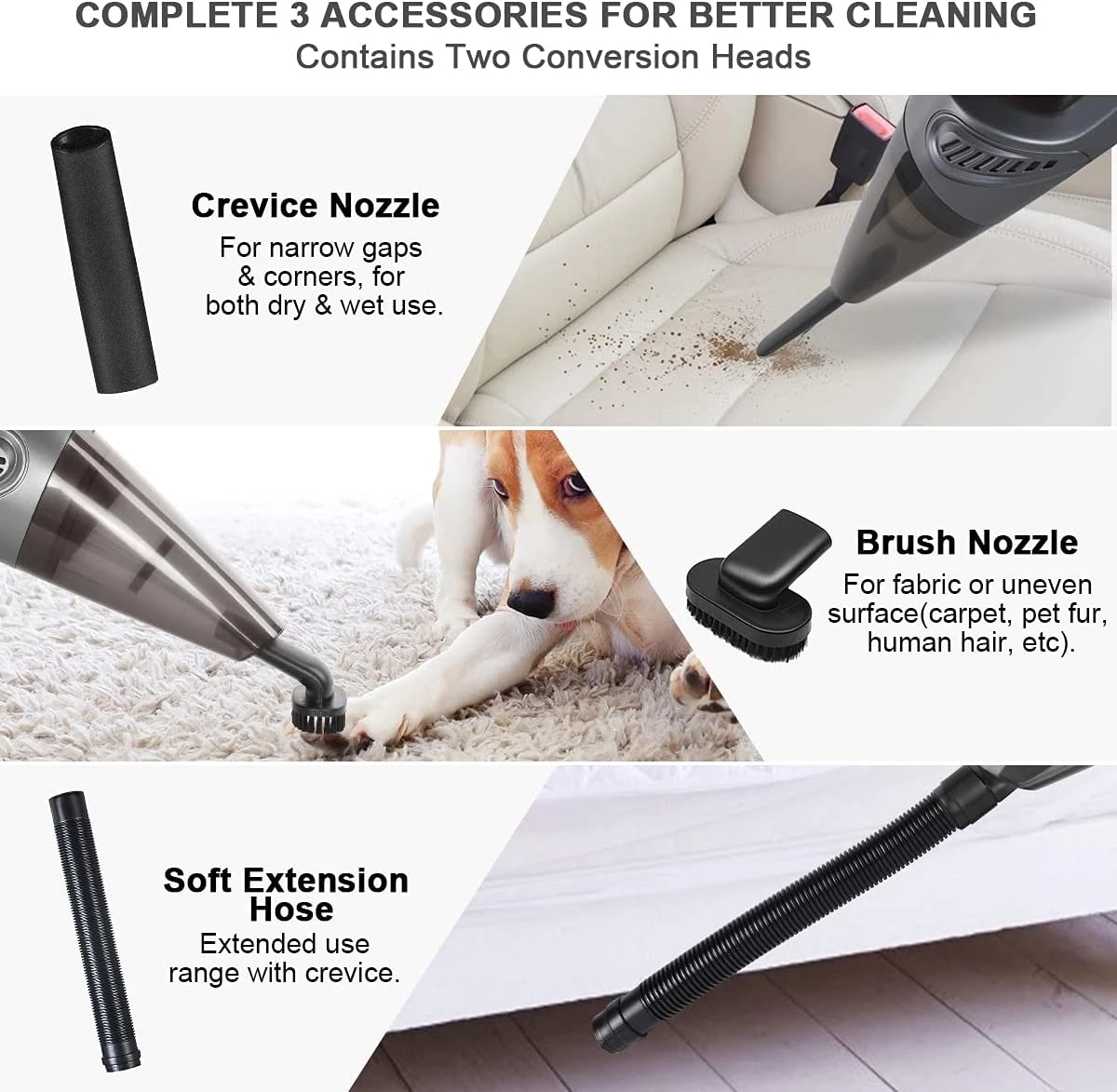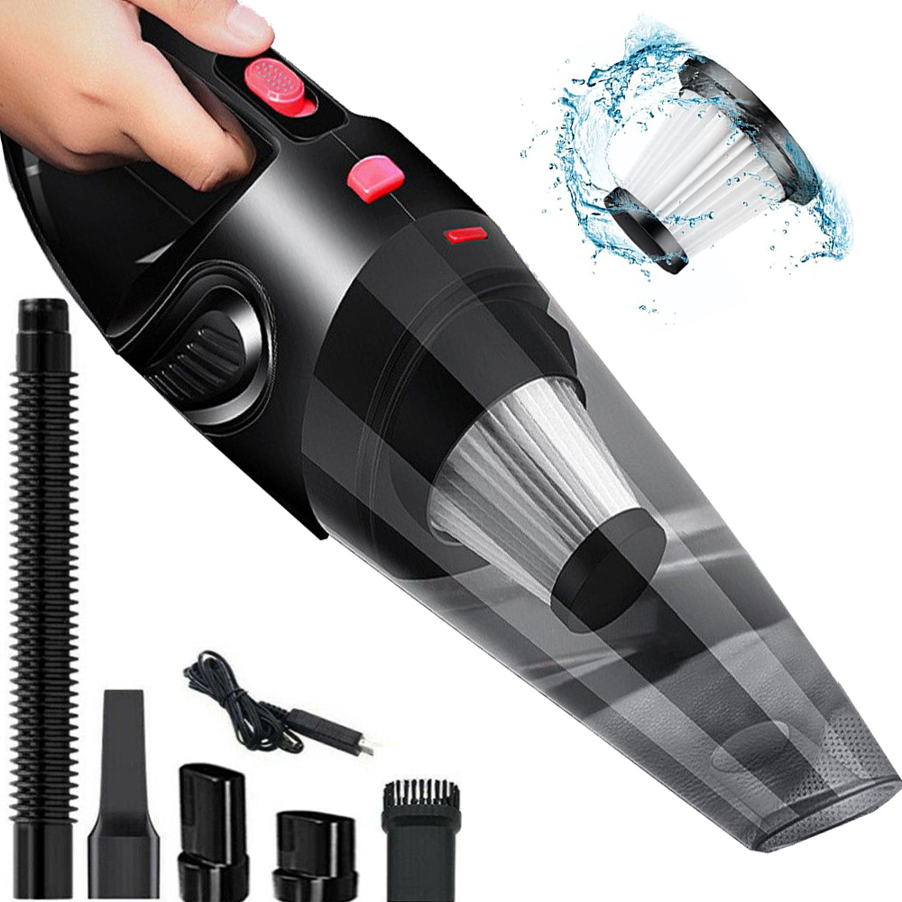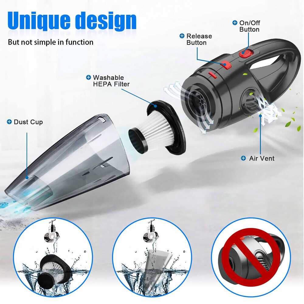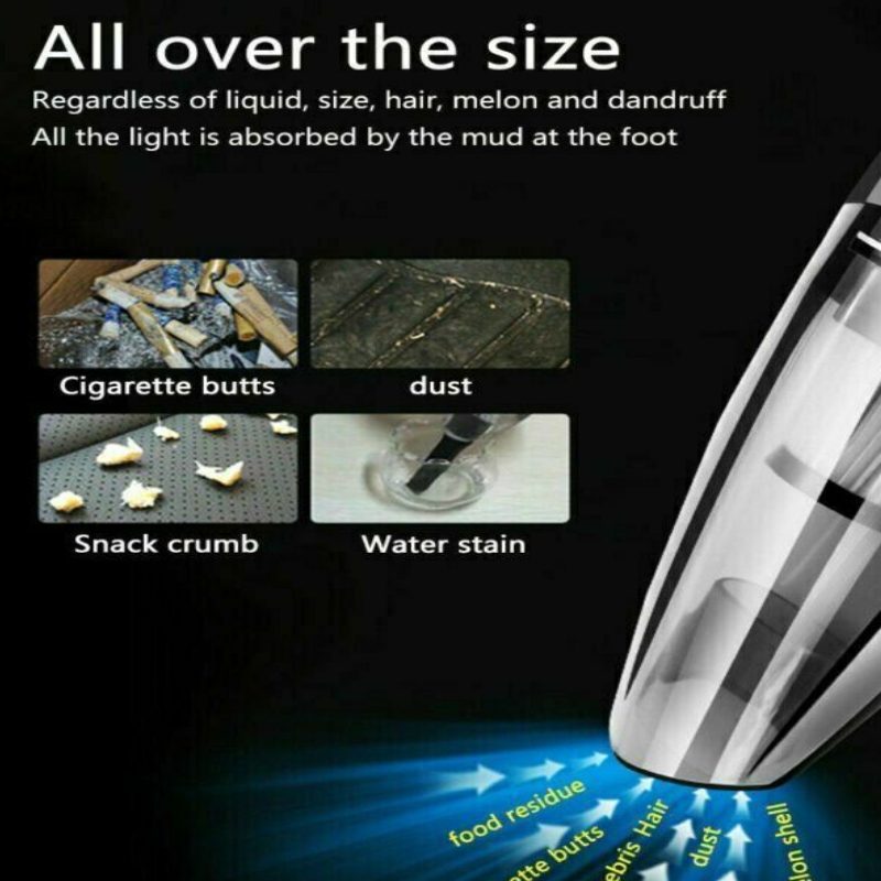 HIGH POWER SUCTION: This upgraded car vacuum cleaner has a much stronger suction power. With a 120 watt motor and a strong suction power of 5500 Pa, it can effectively suck up pet hair, food residue, and grit.