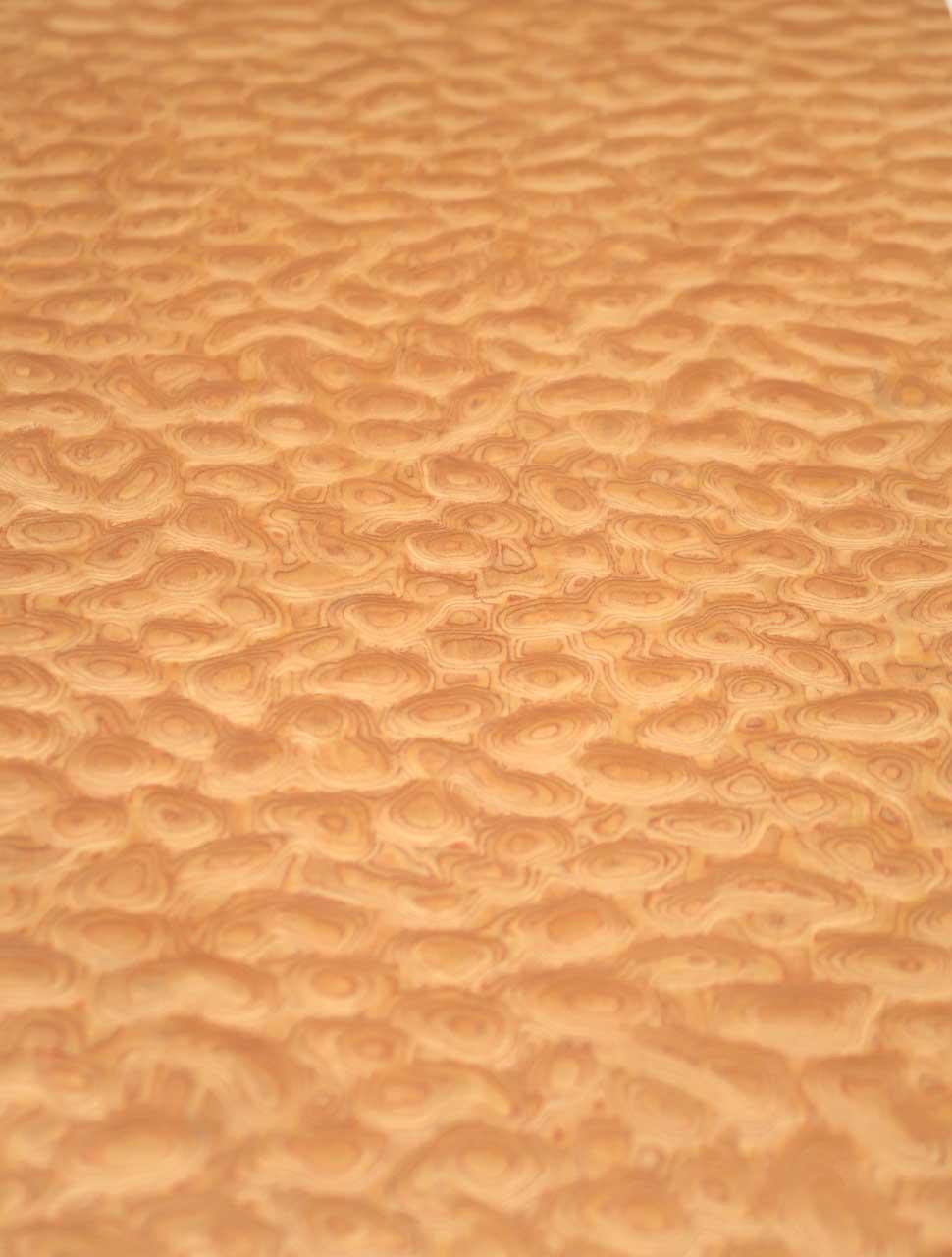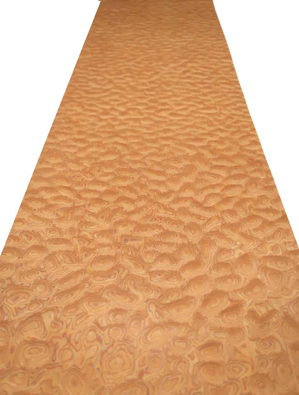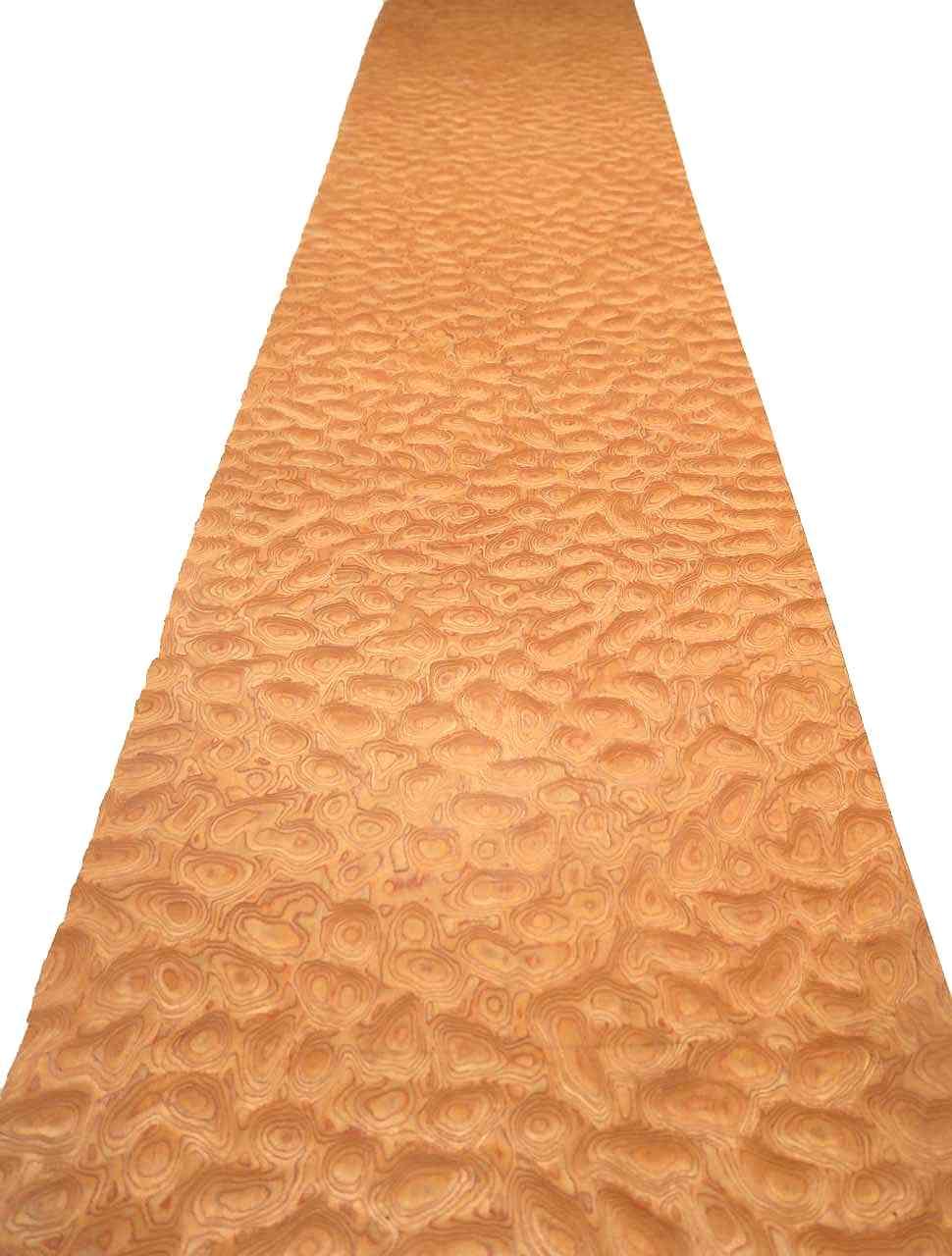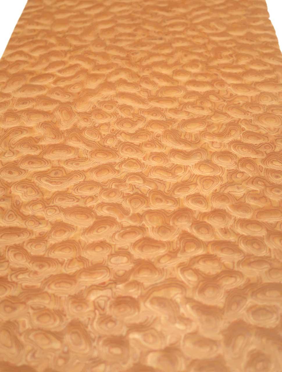 Dieses SaRaiFo* Muschelahorn Furnier (auch Quilted Maple oder Wölkckchenahorn genannt) ist eine ganz neue SaRaiFoHolzfurnier Kreation mit einer gemuschelten / gewölkten Holzstruktur die einem echten gedämpften Muschelahorn sehr ähnlich sieht. Die Grundfarbe ist orange mit einer wilden runden maserartigen Anordnung der Holzstrukturen. Dieses Furnierholz wird aus unzähligen feinen Echtholzlamellen unter vielen verschiedenen Produktionsprozessen verpresst/flächenverleimt (E1) und im Anschluss zu diesem flächigen Holzfurnier verarbeitet, gemessert und ist sehr unregelmäßig von glänzenden und schimmernenden Bereichen im Holz aufgelockert und verleiht der Oberfläche somit ein sehr einzigartiges und besonderes Erscheinungsbild. Dieses Schimmern ist nicht ganz leicht mit einer Kamera festzuhalten - aber je nachdem wie man dieses Designfurnier betrachtet, kommt der Effekt unterschiedlich zur Geltung. Besonders schräg darauf schauend kommt es besser zur Geltung!