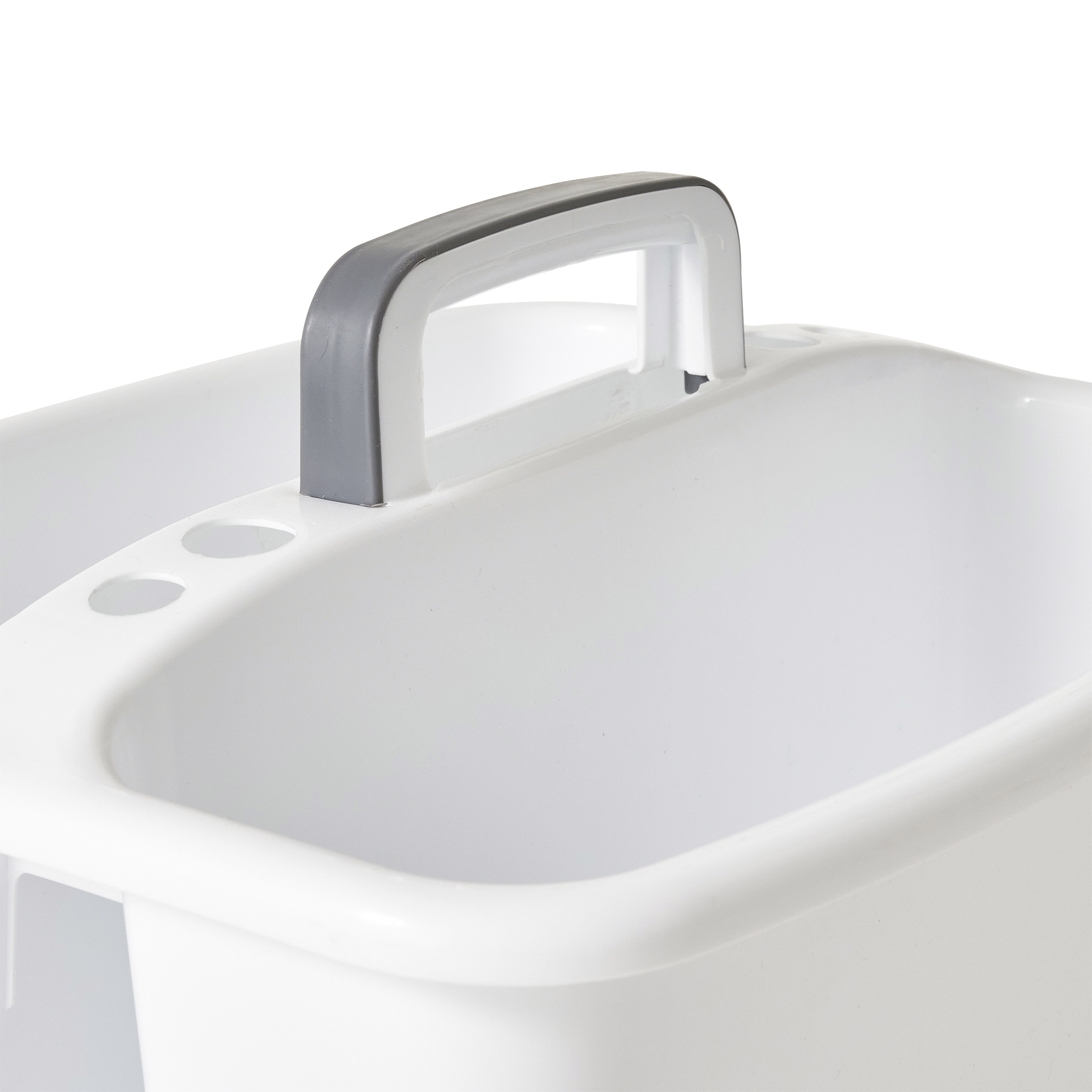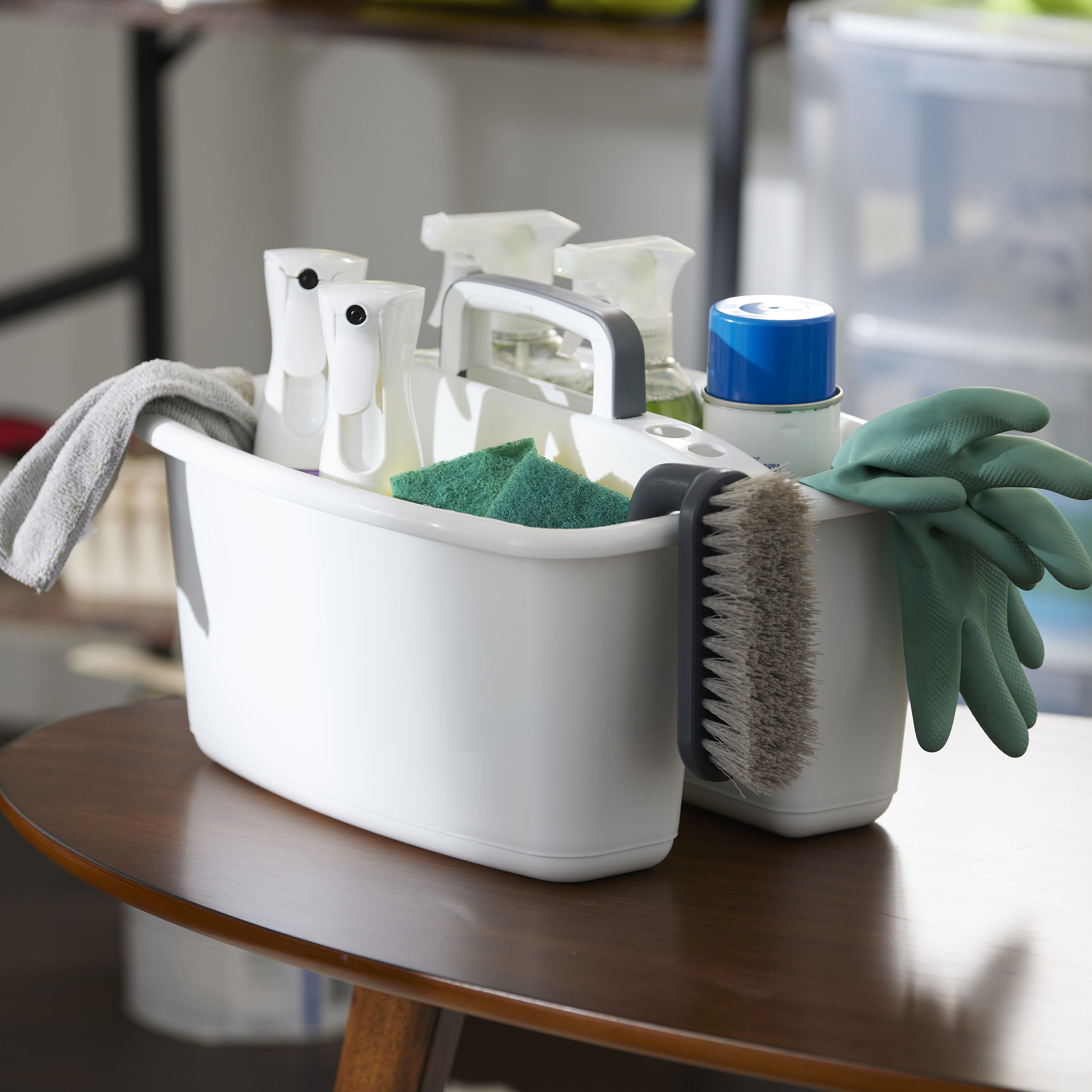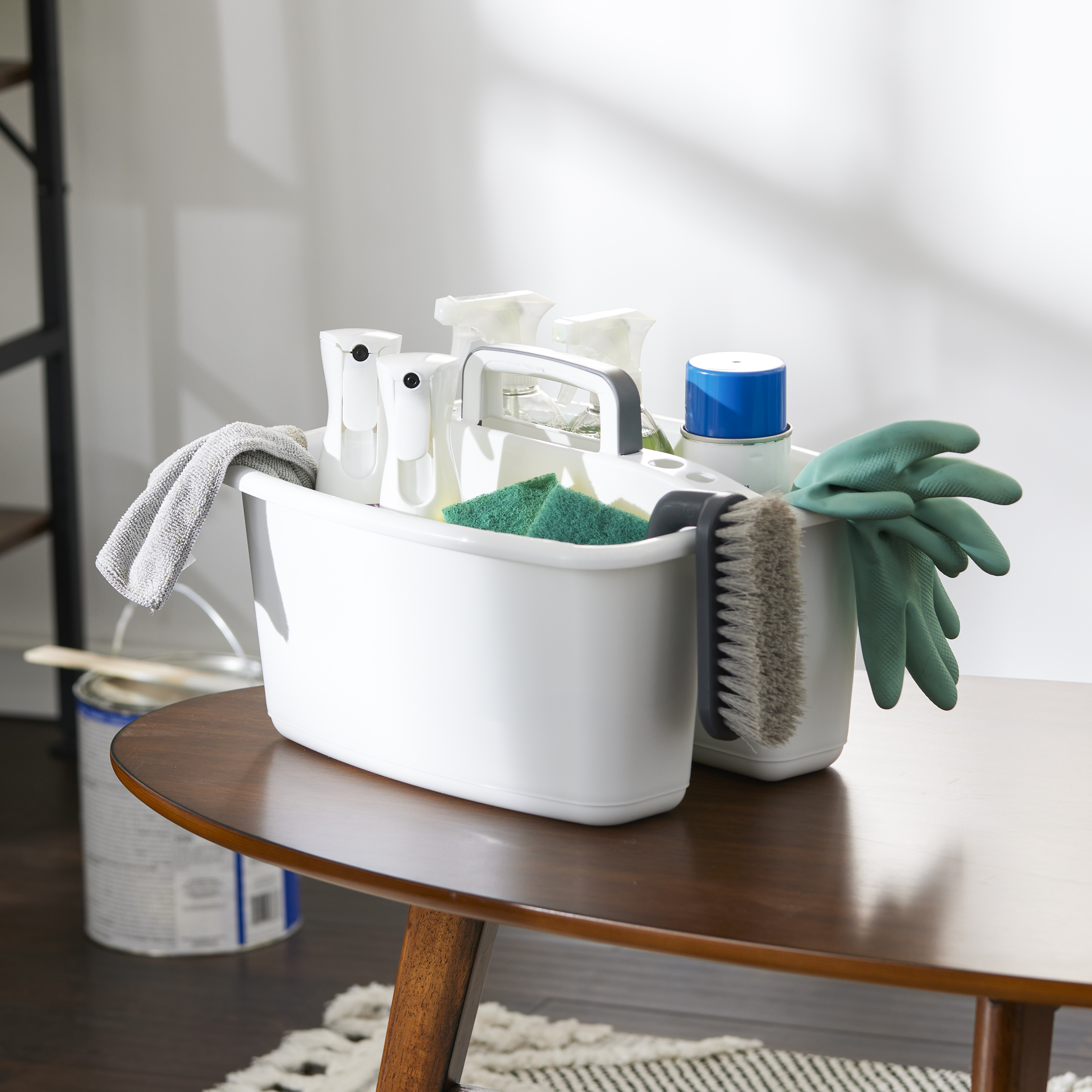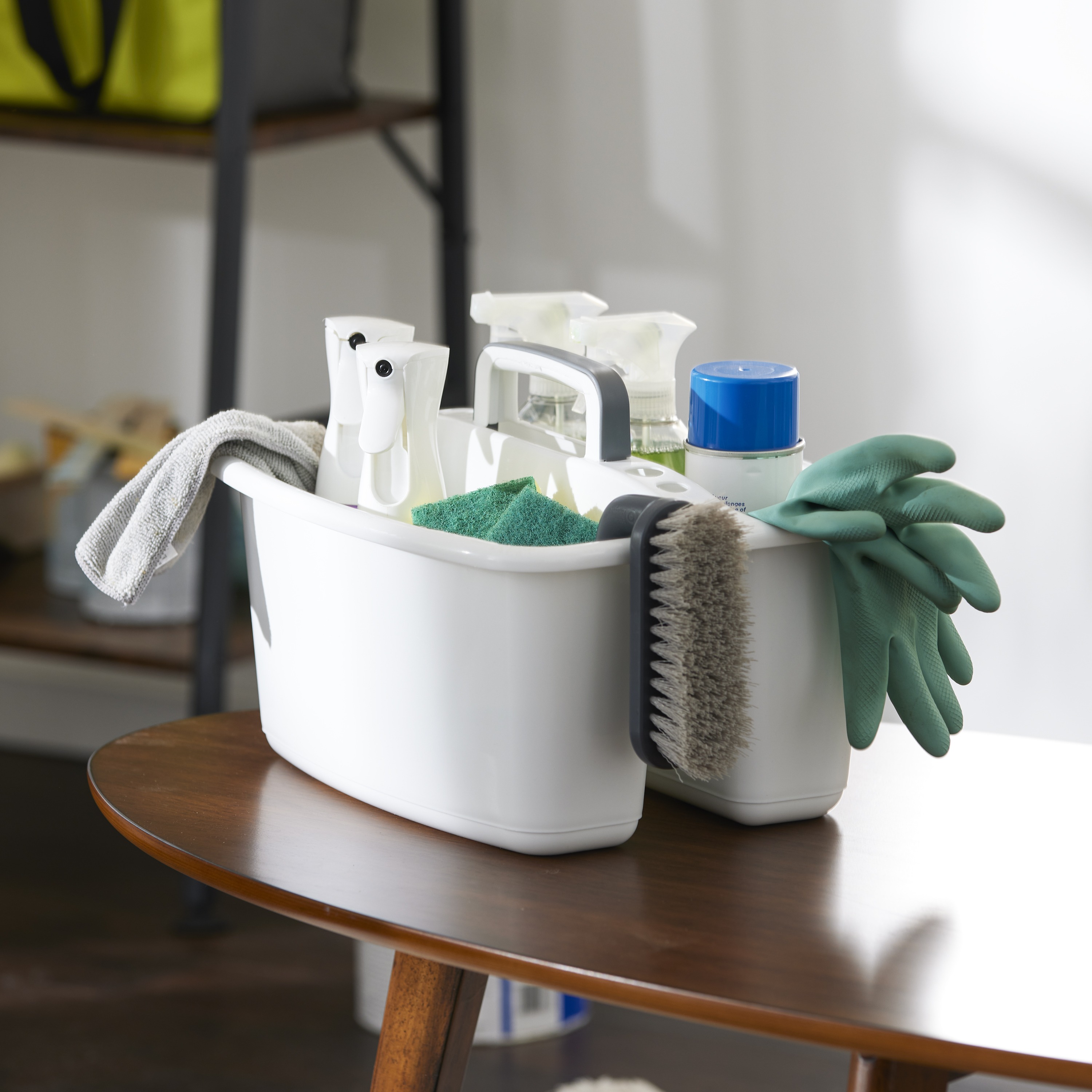 Keep all of your personal supplies neat and tidy in one convenient storage tote. Separate your cleaning supplies between the two sections for enhanced organization. The gray carry handle makes it easy to take this divided storage caddy on-the-go.