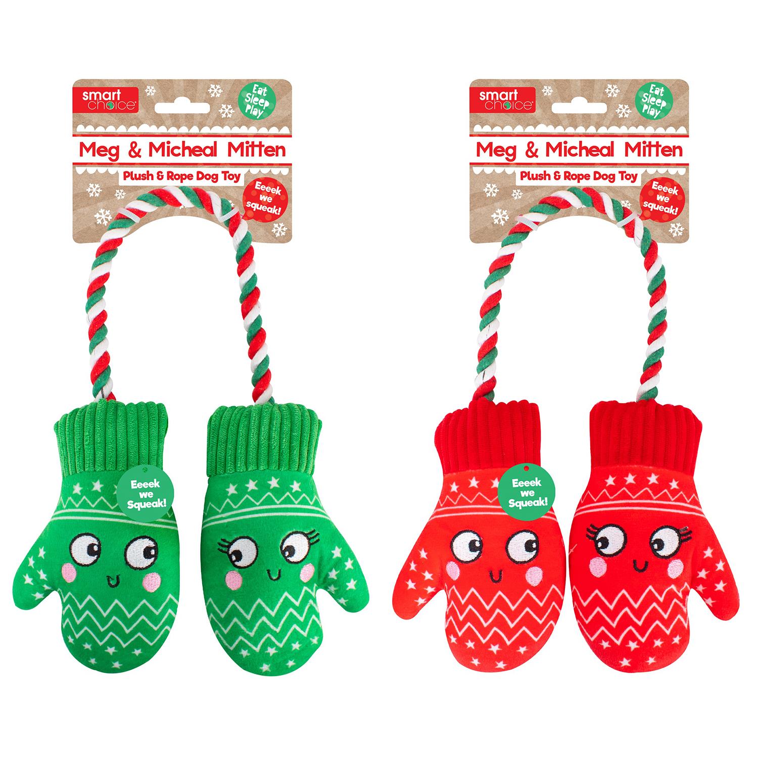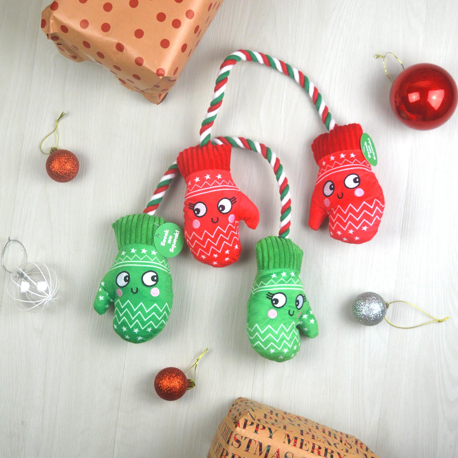 FESTIVE DESIGN: Designed in traditional Christmas colours Red and Green this set is sure to be a hit with any dog featuring winter mittens on the colourful rope. The mittens come with a squeaker each to keep your pet entertained. They are made with pet-safe materials and are durable and easy to clean. The perfect gift for your furry friend this holiday season.