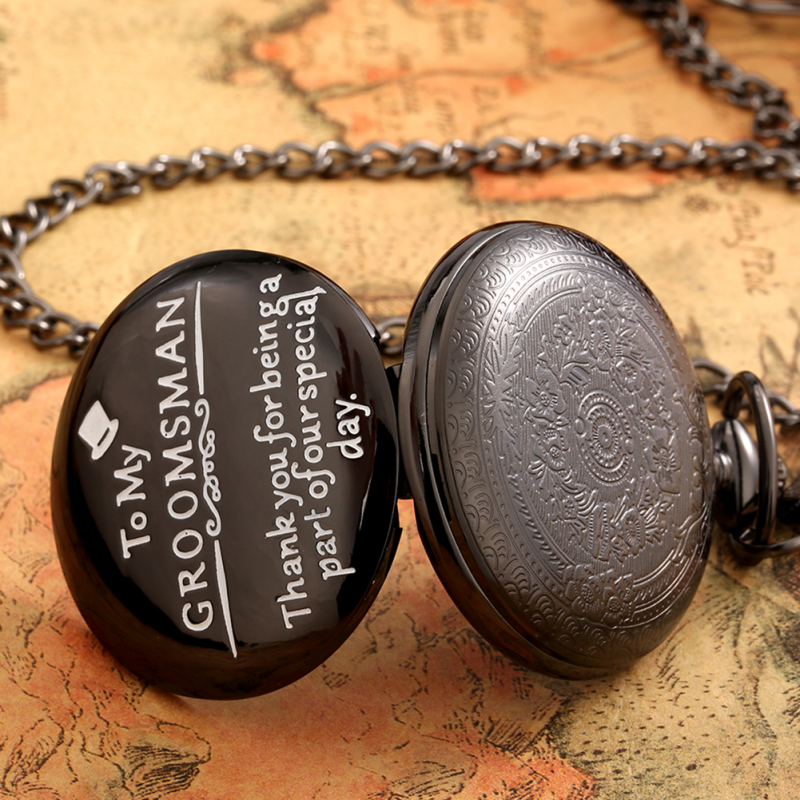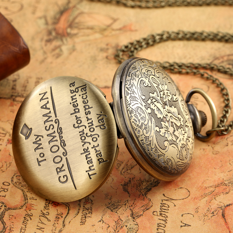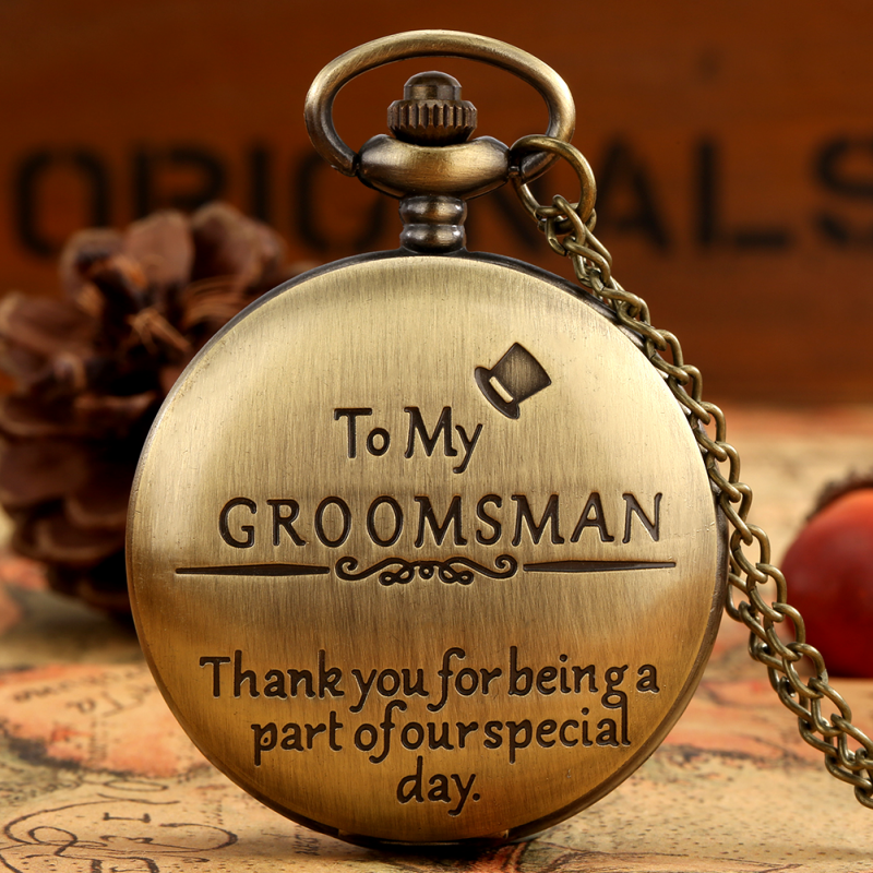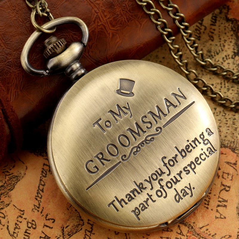 Description: Classic Appearance: This bronze/black watch adds "to my groomsman" text pattern to express your love. Premium Movement: The durable quartz core and durable battery inside, which will ensure the time accurate and keep a constantly work. Legible Reading: It is good for you to read the time be clear at a glance with its large white dial and the Arabic numerals display when you open the case. Fashion Accessories: This pocket watch is both stylish and classic, it can be used as accessories and apparel to match to showcase your personal charm. Best Present: This watch will be the best gift choice for giving to the person your care about when the festivals are coming. Features: 100% Brand New and High Quality. Movement: Quartz Case Material: Alloy Diameter: About 4.6cm Thickness: About 1.4cm Total Length of Chain: About 30cm/80cm Package Content: 1 x Pocket Watch 1 x Chain