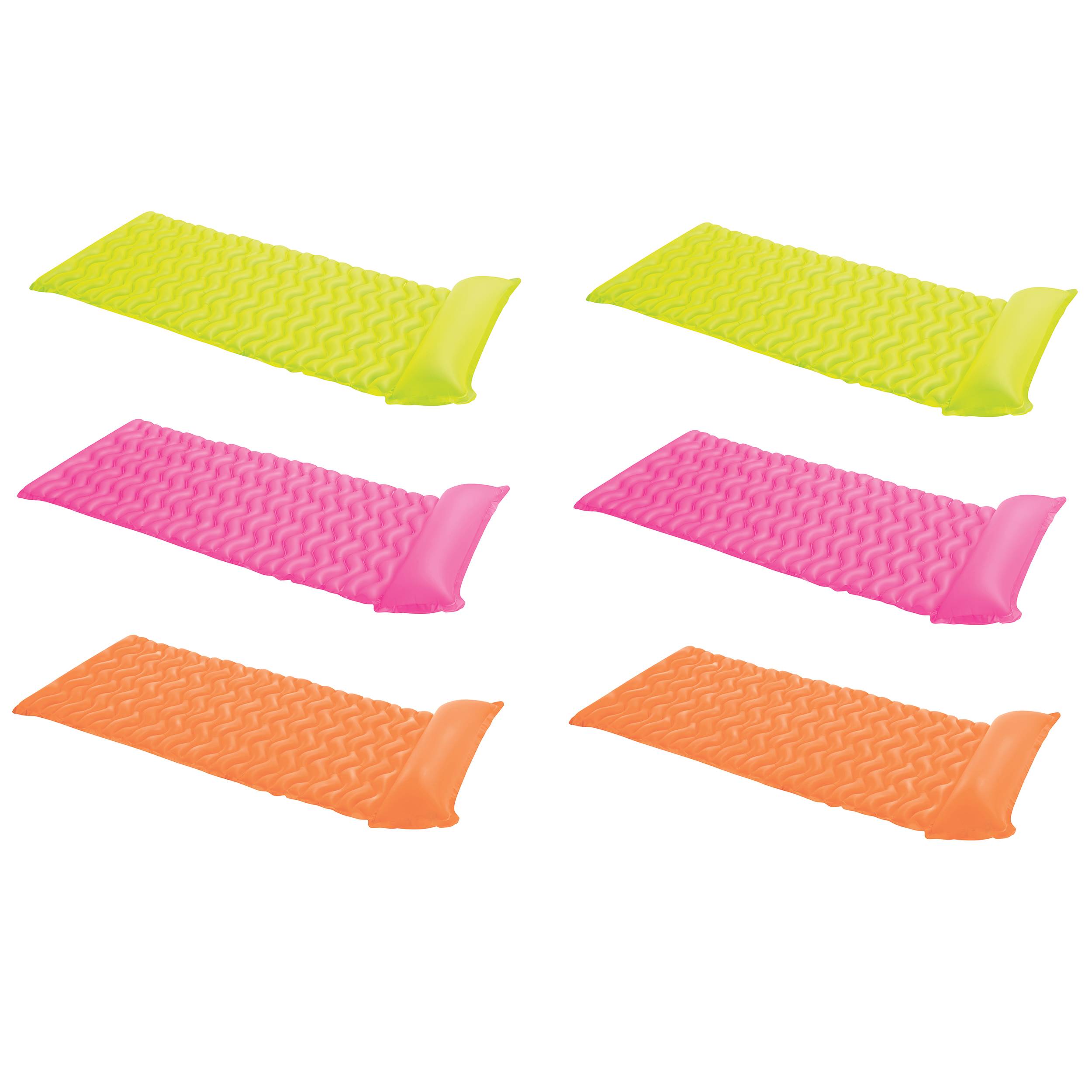 Soak up some rays in comfort and style on these colorful mats. They are available in 3 bright colors including yellow, pink, and orange, and the colors you receive will vary. They feature 2 air chambers, double sealed edges, and built in pillows to chill out to the max.