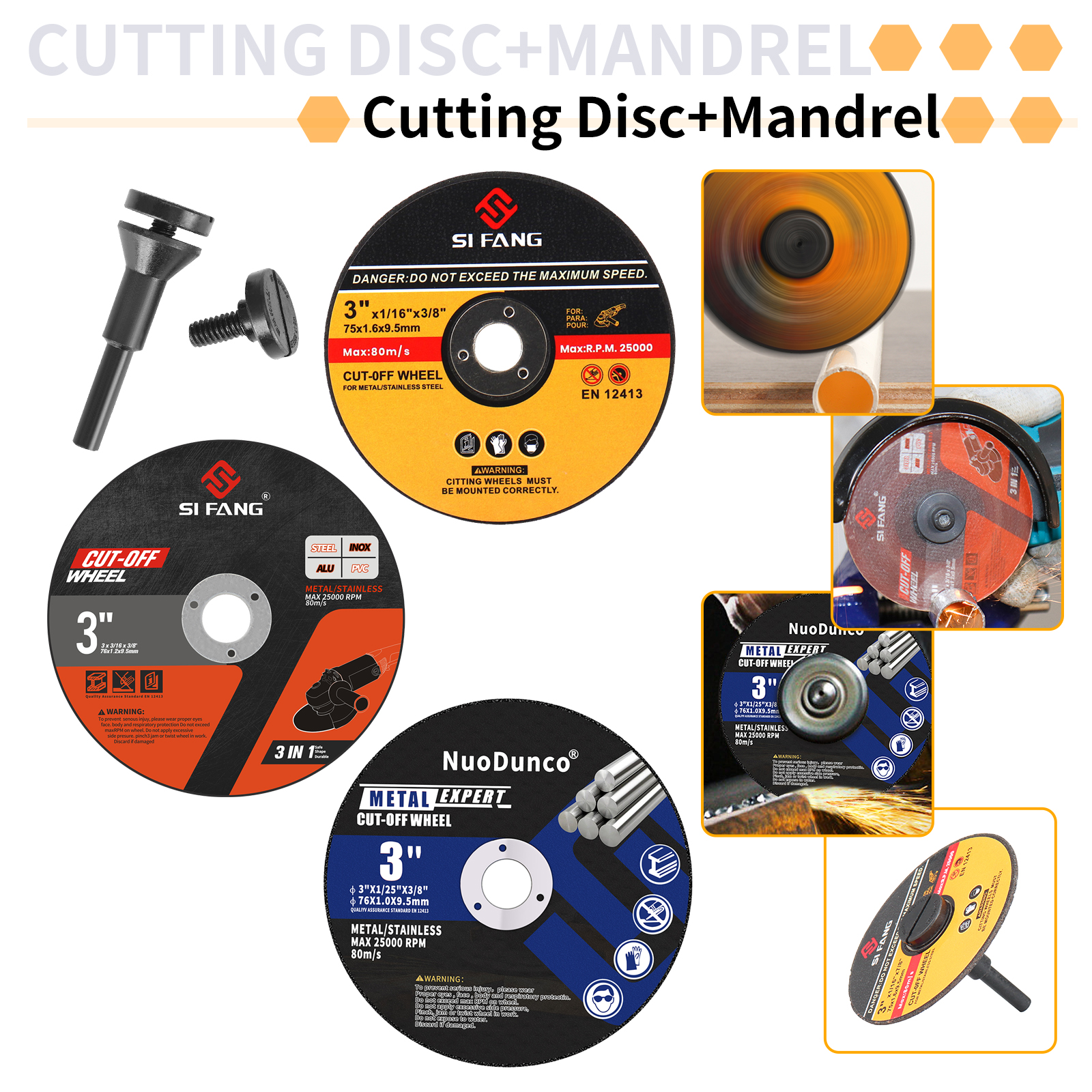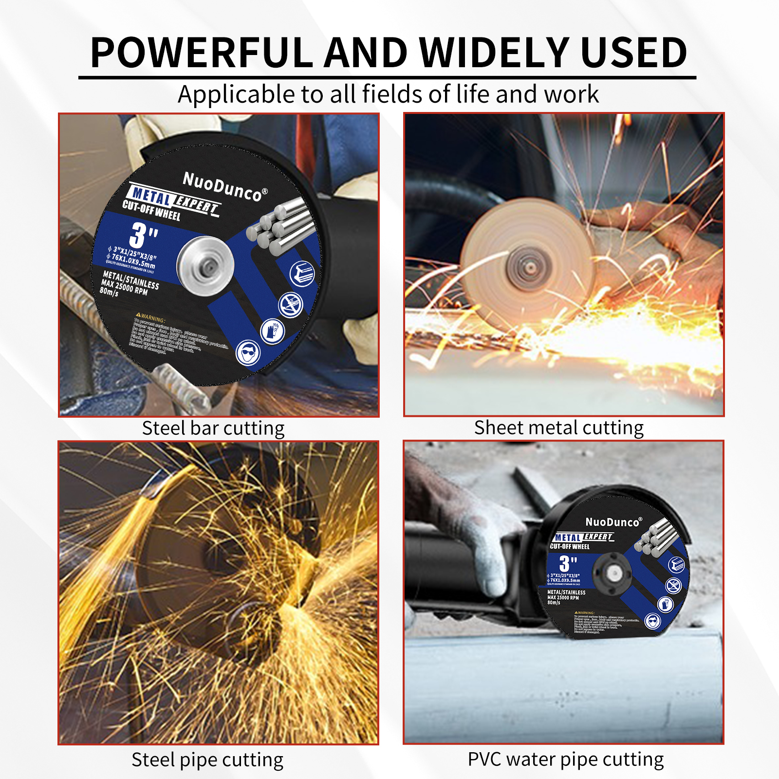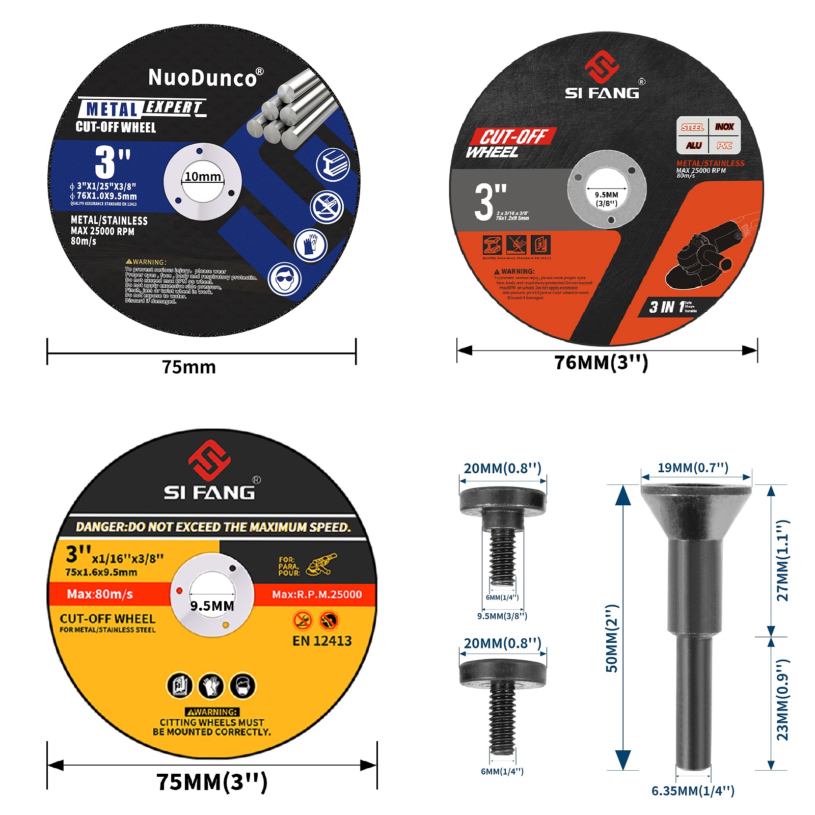 The cutting wheels are suitable for most angle grinders-compatible with all 3" angle grinders and 3/8" arbor, operating speeds up to 25,000 RPM and 80M/S.